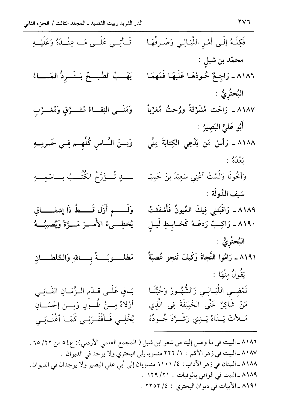 8186 - البيت في ما وصل إلينا من شعر ابن شبل (المجمع العلمي الأردني): ع 54 من 22/ 65.