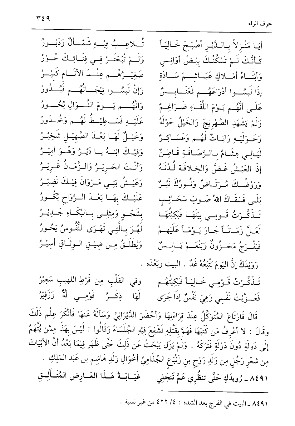 أيَا مَنْزِلًا بِالدَّيْرِ أصْبَحَ خَالِيًا ... تُلاعِبُ فِيْهِ شَمْألٌ وَدَبُورُ
