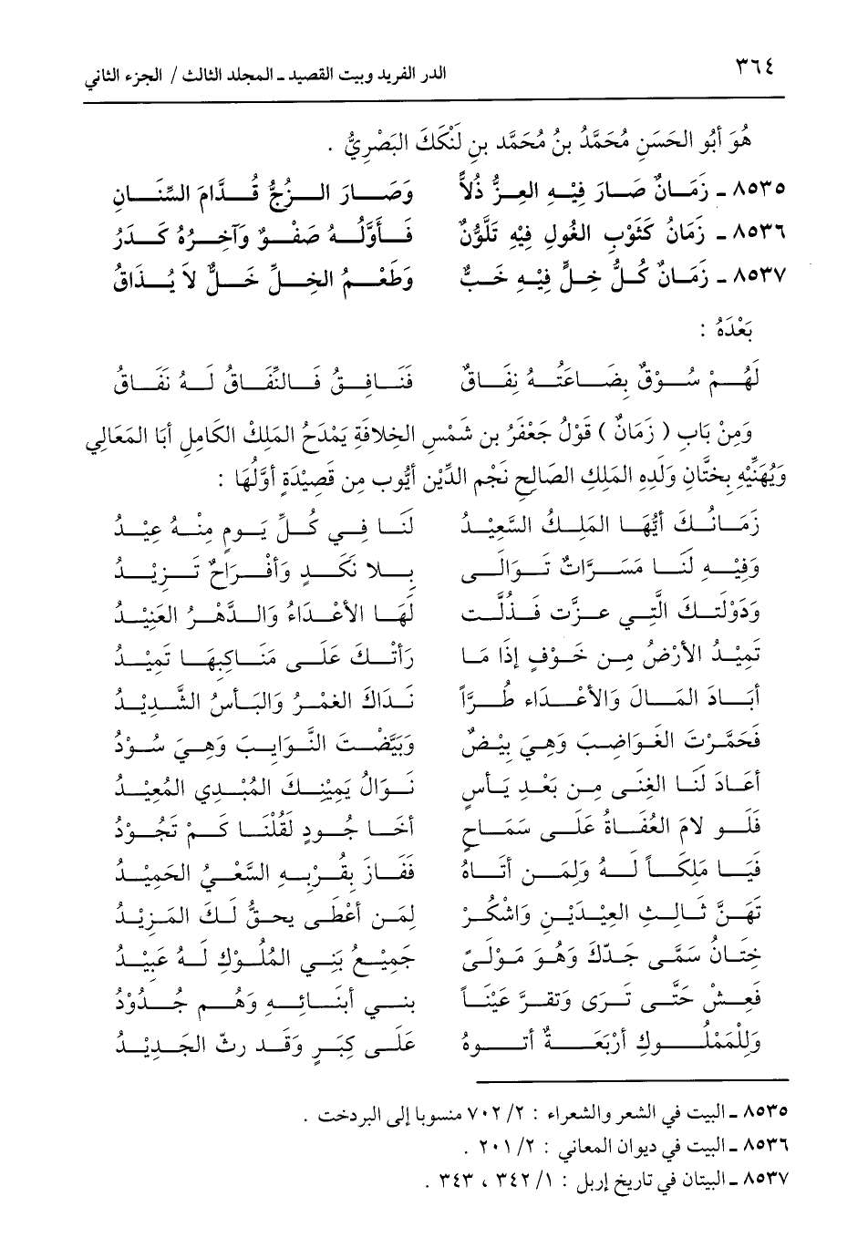 وَمِنْ بَابِ (زَمَانٌ) قَوْلُ جَعْفَرُ بن شَمسِ الخِلافَةِ يَمْدَحُ المَلِكْ الكَامِلِ أبَا المَعَالِي وَيُهنِّيْهِ بِختَّانِ وَلَدِهِ المَلِكِ الصَالح نَجْم الدِّيْن أيُّوب مِن قَصِيْدَةٍ أوَّلُها: