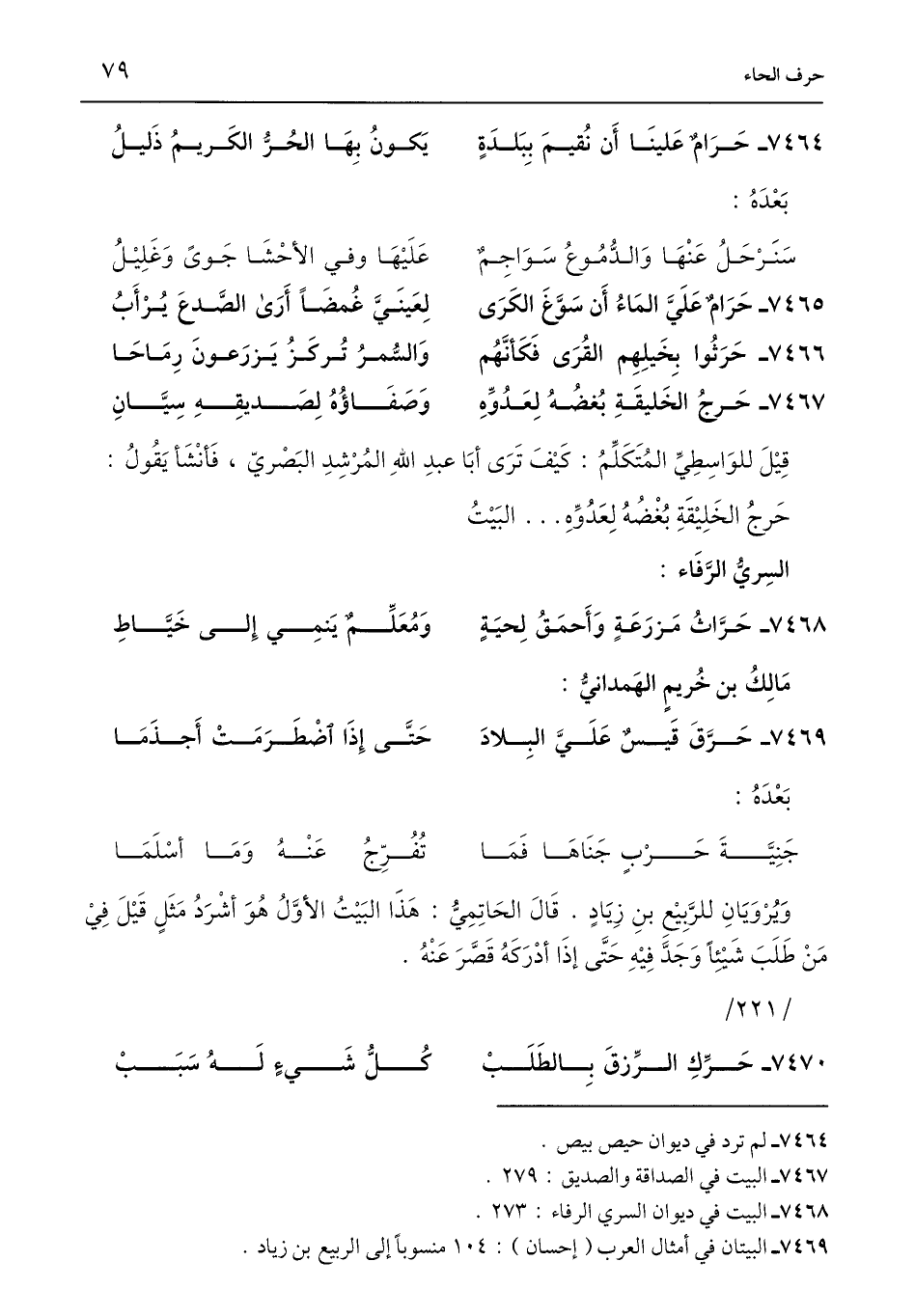 7469 - البيتان في أمثال العرب (إحسان): 104 منسوبًا إلى الربيع بن زياد.