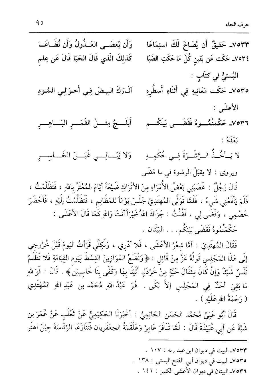 فَقَالَ المُهتَدِيّ: أَمَّا شِعْرُ الأعْشَى، فَلا أدْرِي، وَلَكِنِّي قَرَأتُ اليَومَ قَبْلَ خُرُوجِي إِلَى هَذَا المَجْلِسِ قَولُهُ عَزَّ مِنْ قَائِلٍ: {وَنَضَعُ الْمَوَازِينَ الْقِسْطَ لِيَوْمِ الْقِيَامَةِ فَلَا تُظْلَمُ نَفْسٌ شَيْئًا وَإِنْ كَانَ مِثْقَالَ حَبَّةٍ مِنْ خَرْدَلٍ أَتَيْنَا بِهَا وَكَفَى بِنَا حَاسِبِينَ}. قَالَ: فَوَاللَّهِ مَا بَقِيَ أحَد فِي المَجْلِسِ إِلَّا بَكَى. هُوَ عَبْدُ اللَّهِ مُحَمَّد بن عَبْدِ اللَّهِ المُهْتَدِي (رَحْمَةُ اللَّهِ عَلَيْهِ).