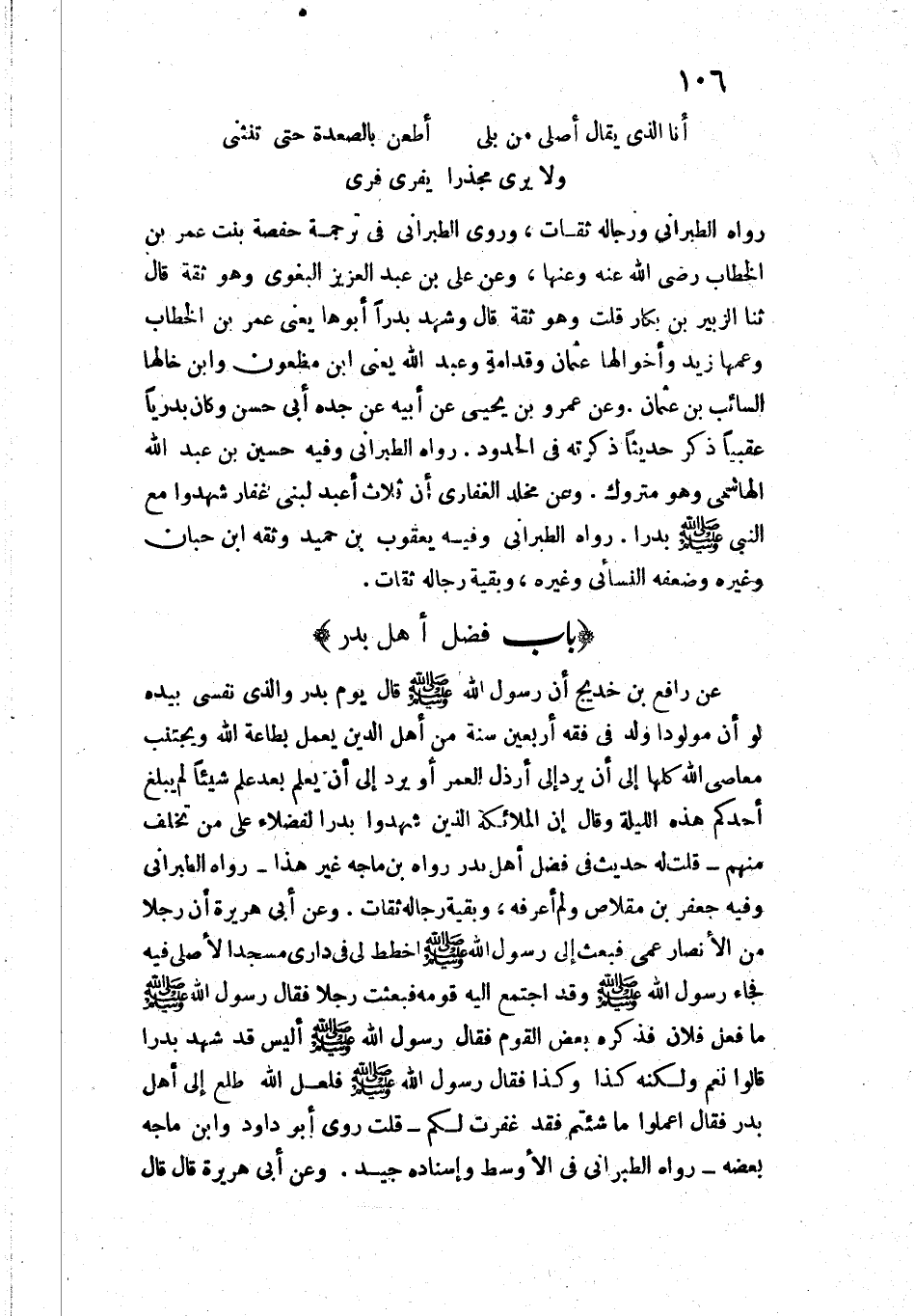10053 - عَنْ رَافِعِ بْنِ خَدِيجٍ أَنَّ رَسُولَ اللَّهِ - صَلَّى اللَّهُ عَلَيْهِ وَسَلَّمَ - قَالَ يَوْمَ بَدْرٍ: " «وَالَّذِي نَفْسِي بِيَدِهِ، لَوْ أَنَّ مَوْلُودًا وُلِدَ فِي فِقْهِ أَرْبَعِينَ سَنَةً مِنْ أَهْلِ الدِّينِ يَعْمَلُ بِطَاعَةِ اللَّهِ، وَيَجْتَنِبُ مَعَاصِيَ اللَّهِ كُلَّهَا إِلَى أَنْ يُرَدَّ إِلَى أَرْذَلِ الْعُمُرِ، أَوْ يُرَدَّ إِلَى أَنْ [لَا] يَعْلَمَ بَعْدَ عَلَمٍ شَيْئًا، لَمْ يَبْلُغْ أَحَدُكُمْ هَذِهِ اللَّيْلَةَ ". وَقَالَ: " إِنَّ الْمَلَائِكَةَ الَّذِينَ شَهِدُوا بَدْرًا لَفُضَلَاءُ عَلَى مَنْ تَخَلَّفَ مِنْهُمْ» ".