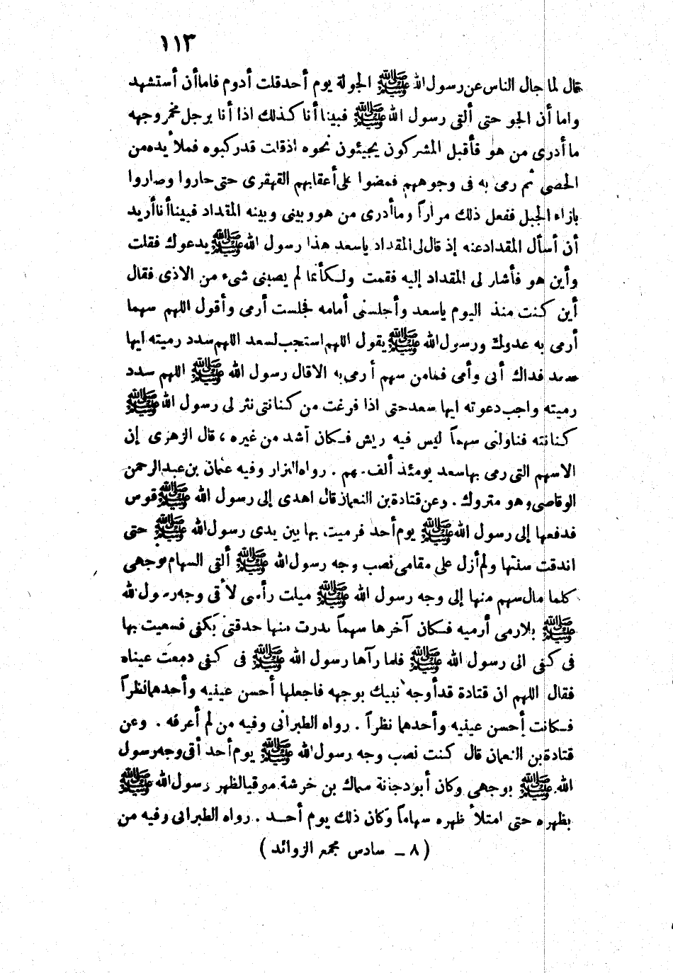 قَالَ: «لَمَّا جَالَ النَّاسُ عَنْ رَسُولِ اللَّهِ - صَلَّى اللَّهُ عَلَيْهِ وَسَلَّمَ - الْجَوْلَةَ يَوْمَ أُحُدٍ قُلْتُ: أَدُومُ فَإِمَّا أَنْ أَسْتَشْهِدَ، وَإِمَّا أَنْ أَنْجُوَ حَتَّى أَلْقَى رَسُولَ اللَّهِ - صَلَّى اللَّهُ عَلَيْهِ وَسَلَّمَ - فَبَيْنَا أَنَا كَذَلِكَ إِذَا أَنَا بِرَجُلٍ مُخَمَّرٍ وَجْهُهُ مَا أَدْرِي مَنْ هُوَ، فَأَقْبَلَ الْمُشْرِكُونَ يَجِيئُونَ نَحْوَهُ، إِذْ قُلْتُ: قَدْ رَكِبُوهُ، فَمَلَأَ يَدَهُ مِنَ الْحَصَى ثُمَّ رَمَى بِهِ فِي وُجُوهِهِمْ، فَمَضَوْا عَلَى أَعْقَابِهِمُ الْقَهْقَرَى حَتَّى حَارُوا وَصَارُوا بِإِزَاءِ الْجَبَلِ، فَفَعَلَ ذَلِكَ مِرَارًا وَمَا أَدْرِي مَنْ هُوَ، وَبَيْنِي وَبَيْنَهُ الْمِقْدَادُ، فَبَيْنَا أَنَا أُرِيدُ أَنْ أَسْأَلَ الْمِقْدَادَ عَنْهُ إِذْ قَالَ لِي الْمِقْدَادُ: يَا سَعْدُ، هَذَا رَسُولُ اللَّهِ - صَلَّى اللَّهُ عَلَيْهِ وَسَلَّمَ - يَدْعُوكَ، فَقُلْتُ: وَأَيْنَ هُوَ؟ فَأَشَارَ لِي الْمِقْدَادُ إِلَيْهِ، فَقُمْتُ وَلَكَأَنَّمَا لَمْ يُصِبْنِي شَيْءٌ مِنَ الْأَذَى، فَقَالَ: " أَيْنَ كُنْتَ مُنْذُ الْيَوْمِ يَا سَعْدُ؟ " وَأَجْلَسَنِي أَمَامَهُ فَجَلَسْتُ أَرْمِي وَأَقُولُ: اللَّهُمَّ سَهْمًا أَرْمِي بِهِ عَدُوَّكَ، وَرَسُولُ اللَّهِ - صَلَّى اللَّهُ عَلَيْهِ وَسَلَّمَ - يَقُولُ: " اللَّهُمَّ اسْتَجِبْ لِسَعْدٍ، اللَّهُمَّ سَدِّدْ رَمْيَتَهُ، إِيهًا سَعْدُ فِدَاكَ أَبِي وَأُمِّي "، فَمَا مِنْ سَهْمٍ أَرْمِي بِهِ إِلَّا قَالَ رَسُولُ اللَّهِ - صَلَّى اللَّهُ عَلَيْهِ وَسَلَّمَ: " اللَّهُمَّ سَدِّدْ رَمْيَتَهُ، وَأَجِبْ دَعْوَتَهُ، إِيهًا سَعْدُ "، حَتَّى إِذَا فَرَغْتُ مِنْ كِنَانَتِي نَثَرَ لِي رَسُولُ اللَّهِ - صَلَّى اللَّهُ عَلَيْهِ وَسَلَّمَ - كِنَانَتَهُ، فَنَاوَلَنِي سَهْمًا لَيْسَ فِيهِ رِيشٌ، فَكَانَ أَشَدَّ مِنْ غَيْرِهِ.