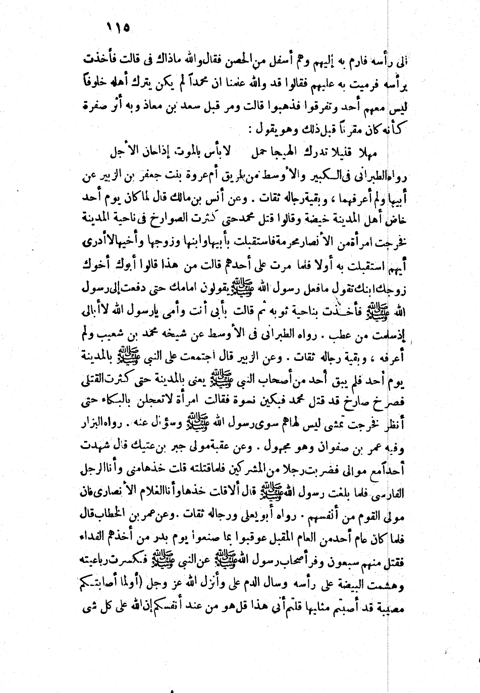 10088 - وَعَنِ الزُّبَيْرِ قَالَ: «اجْتَمَعْتُ عَلَى النَّبِيِّ - صَلَّى اللَّهُ عَلَيْهِ وَسَلَّمَ - بِالْمَدِينَةِ يَوْمَ أُحُدٍ، فَلَمْ يَبْقَ أَحَدٌ مِنْ أَصْحَابِ النَّبِيِّ - صَلَّى اللَّهُ عَلَيْهِ وَسَلَّمَ - يَعْنِي بِالْمَدِينَةِ - حَتَّى كَثُرَتِ الْقَتْلَى فَصَرَخَ صَارِخٌ: قَدْ قُتِلَ مُحَمَّدٌ، فَبَكَيْنَ نِسْوَةٌ، فَقَالَتِ امْرَأَةٌ: لَا تُعَجِّلْنَ بِالْبُكَاءِ حَتَّى أَنْظُرَ، فَخَرَجَتْ تَمْشِي لَيْسَ لَهَا هَمٌّ سِوَى رَسُولِ اللَّهِ - صَلَّى اللَّهُ عَلَيْهِ وَسَلَّمَ - وَسُؤَالٍ عَنْهُ».