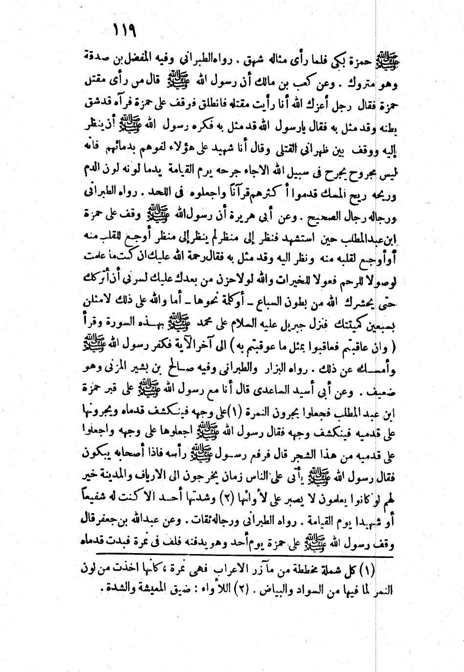 10105 - «وَعَنْ أَبِي أُسَيْدٍ السَّاعَدِيِّ قَالَ: أَنَا مَعَ رَسُولِ اللَّهِ - صَلَّى اللَّهُ عَلَيْهِ وَسَلَّمَ - عَلَى قَبْرِ حَمْزَةَ بْنِ عَبْدِ الْمُطَّلِبِ، فَجَعَلُوا يَجُرُّونَ النَّمِرَةَ عَلَى وَجْهِهِ فَتَنْكَشِفُ قَدَمَاهُ، وَيَجُرُّونَهَا عَلَى قَدَمَيْهِ فَيَنْكَشِفُ وَجْهُهُ، فَقَالَ رَسُولُ اللَّهِ - صَلَّى اللَّهُ عَلَيْهِ وَسَلَّمَ: " اجْعَلُوهَا عَلَى وَجْهِهِ، وَاجْعَلُوا عَلَى قَدَمَيْهِ مِنْ هَذَا الشَّجَرِ "، قَالَ: فَرَفَعَ رَسُولُ اللَّهِ - صَلَّى اللَّهُ عَلَيْهِ وَسَلَّمَ - رَأْسَهُ، فَإِذَا أَصْحَابُهُ يَبْكُونَ، فَقَالَ رَسُولُ اللَّهِ - صَلَّى اللَّهُ عَلَيْهِ وَسَلَّمَ: " إِنَّهُ يَأْتِي عَلَى النَّاسِ زَمَانٌ يَخْرُجُونَ إِلَى الْأَرْيَافِ فَيُصِيبُونَ بِهَا مَطْعَمًا وَمَسْكَنًا وَمَرْكَبًا - أَوْ قَالَ: مَرَاكِبَ - فَيَكْتُبُونَ إِلَى أَهْلِيهِمْ هَلُمَّ إِلَيْنَا، فَإِنَّكُمْ بِأَرْضِ حِجَازٍ جَدْوَبَةٍ وَالْمَدِينَةُ خَيْرٌ لَهُمْ لَوْ كَانُوا يَعْلَمُونَ، لَا يَصْبِرُ عَلَى لَأْوَائِهَا وَشِدَّتِهَا أَحَدٌ إِلَّا كُنْتُ لَهُ شَفِيعًا أَوْ شَهِيدًا يَوْمَ الْقِيَامَةِ» ".