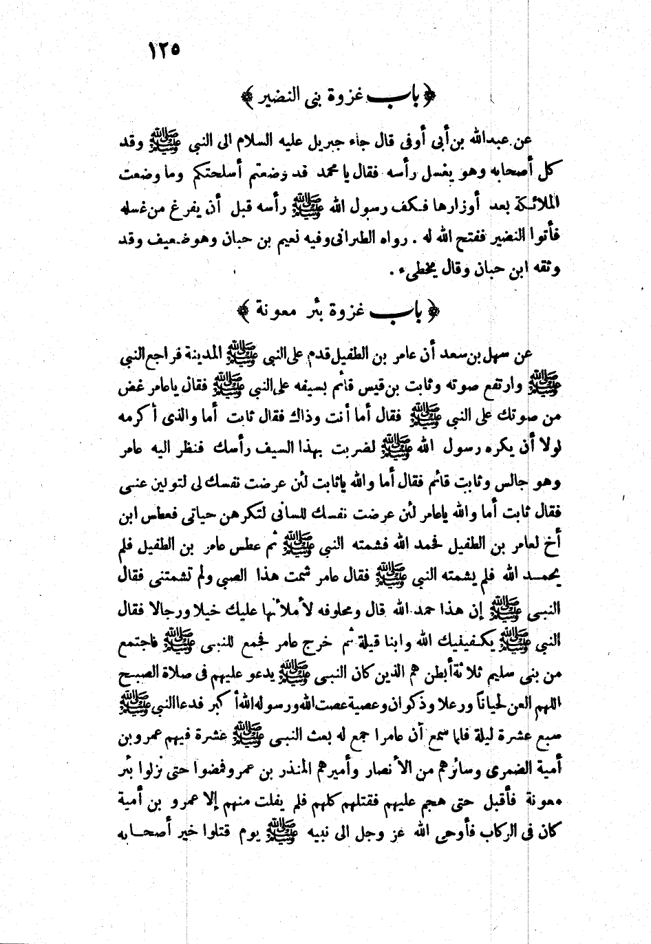 10125 - عَنْ عَبْدِ اللَّهِ بْنِ أَبِي أَوْفَى قَالَ: «جَاءَ جِبْرِيلُ - عَلَيْهِ السَّلَامُ - إِلَى النَّبِيِّ - صَلَّى اللَّهُ عَلَيْهِ وَسَلَّمَ - وَقَدْ كَلَّ أَصْحَابُهُ، وَهُوَ يَغْسِلُ رَأْسَهُ، فَقَالَ: يَا مُحَمَّدُ، قَدْ وَضَعْتُمْ أَسْلِحَتَكُمْ وَمَا وَضَعَتِ الْمَلَائِكَةُ بَعْدُ أَوْزَارَهَا، فَكَفَّ رَسُولُ اللَّهِ - صَلَّى اللَّهُ عَلَيْهِ وَسَلَّمَ - رَأْسَهُ قَبْلَ أَنْ يَفْرَغَ مِنْ غَسْلِهِ، فَأَتَوُا النَّضِيرَ، فَفَتَحَ اللَّهُ لَهُ».