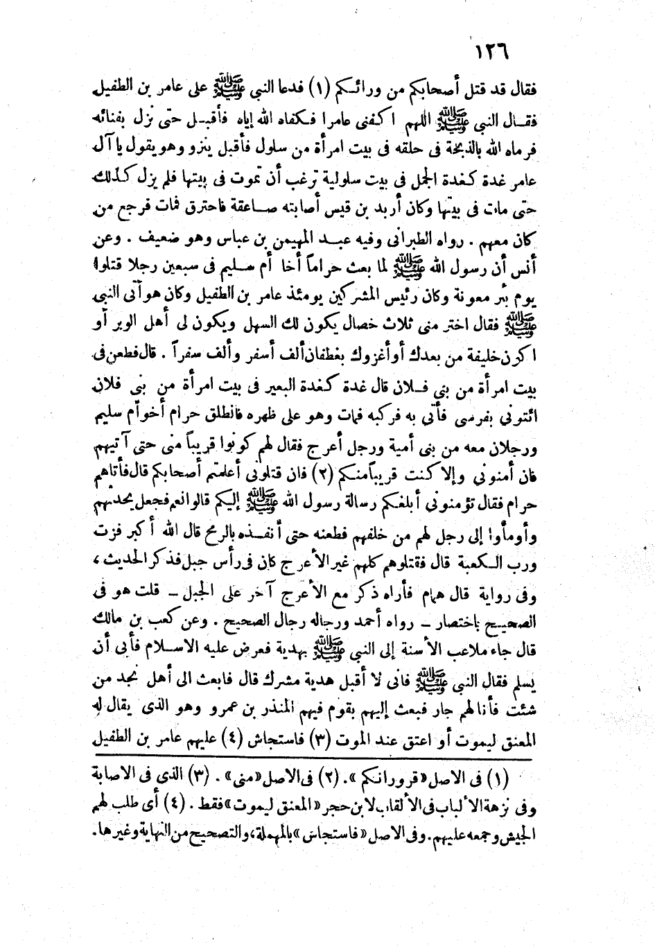 فَقَالَ: " قَدْ قُتِلَ أَصْحَابُكُمْ مِنْ وَرَائِكُمْ " فَدَعَا النَّبِيُّ - صَلَّى اللَّهُ عَلَيْهِ وَسَلَّمَ - عَلَى عَامِرِ بْنِ الطُّفَيْلِ، فَقَالَ النَّبِيُّ - صَلَّى اللَّهُ عَلَيْهِ وَسَلَّمَ: " اللَّهُمَّ اكْفِنِي عَامِرًا " فَكَفَاهُ اللَّهُ إِيَّاهُ، فَأَقْبَلَ حَتَّى نَزَلَ بِفِنَائِهِ، فَرَمَاهُ اللَّهُ بِالذَّبْحَةِ فِي حَلْقِهِ فِي بَيْتِ امْرَأَةٍ مِنْ سَلُولٍ، فَأَقْبَلَ يَنْزُو وَهُوَ يَقُولُ: يَا آلَ عَامِرٍ غُدَّةٌ كَغُدَّةِ الْجَمَلِ فِي بَيْتِ سَلُولِيَّةٍ تَرْغَبُ أَنْ تَمُوتَ فِي بَيْتِهَا، فَلَمْ يَزَلْ كَذَلِكَ حَتَّى مَاتَ فِي بَيْتِهَا، وَكَانَ أَرْبَدُ بْنُ قَيْسٍ أَصَابَتْهُ صَاعِقَةٌ فَاحْتَرَقَ فَمَاتَ، فَرَجَعَ مَنْ كَانَ مَعَهُمْ».