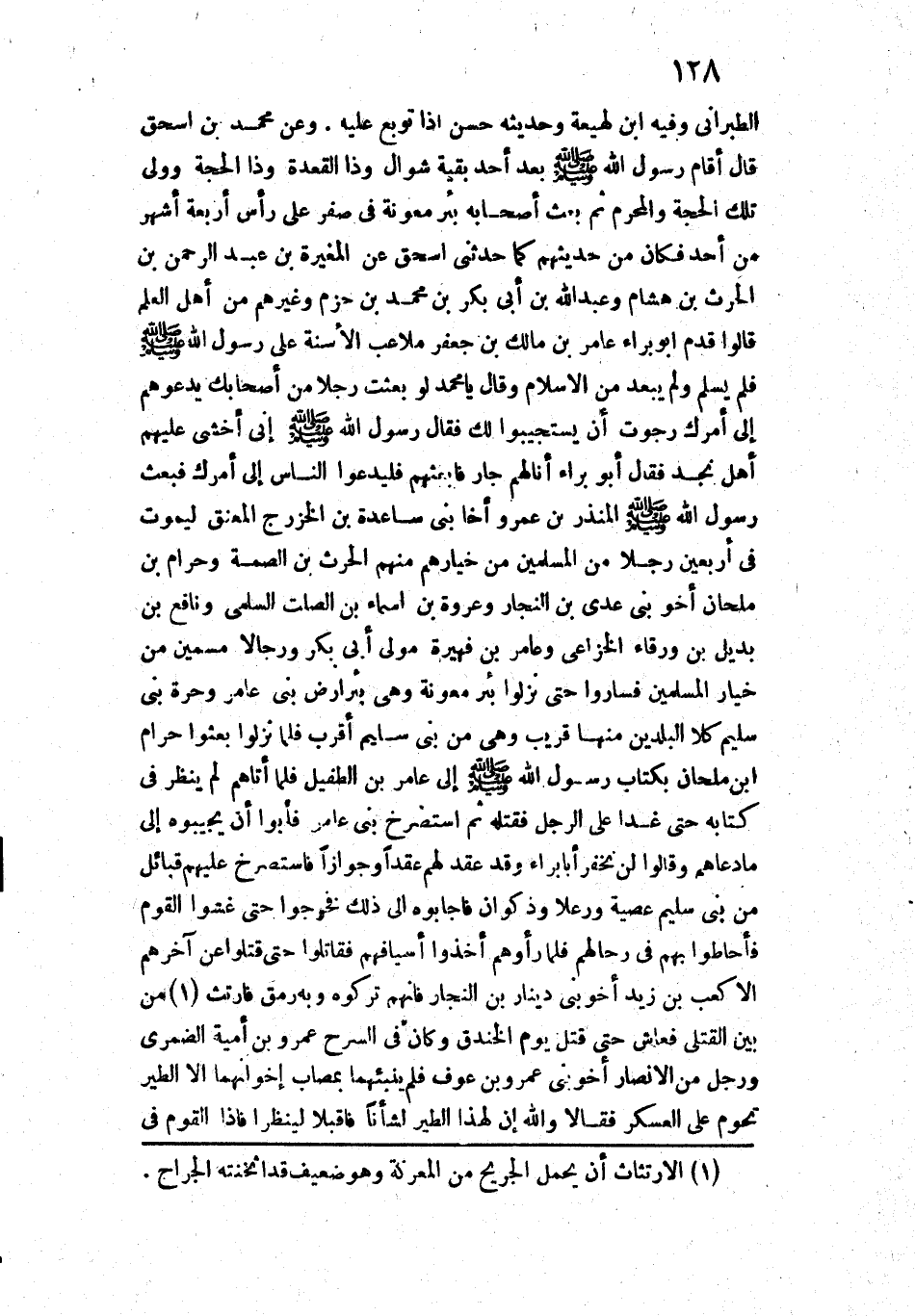 10132 - وَعَنْ مُحَمَّدِ بْنِ إِسْحَاقَ قَالَ: «أَقَامَ رَسُولُ اللَّهِ - صَلَّى اللَّهُ عَلَيْهِ وَسَلَّمَ - بَعْدَ أُحُدٍ بَقِيَّةَ شَوَّالٍ وَذَا الْقَعْدَةِ وَذَا الْحِجَّةِ، وَوَلَّى تِلْكَ الْحِجَّةُ وَالْمُحَرَّمُ، ثُمَّ بَعَثَ أَصْحَابَهُ بِئْرَ مَعُونَةَ فِي صَفَرٍ عَلَى رَأْسِ أَرْبَعَةِ أَشْهُرٍ مِنْ أُحُدٍ، فَكَانَ مِنْ حَدِيثِهِمْ كَمَا حَدَّثَنِي إِسْحَاقُ، عَنِ الْمُغِيرَةِ بْنِ عَبْدِ الرَّحْمَنِ بْنِ الْحَارِثِ بْنِ هِشَامٍ، وَعَبْدُ اللَّهِ بْنُ أَبِي بَكْرِ بْنِ مُحَمَّدِ بْنِ عَمْرِو بْنِ حَزْمٍ، وَغَيْرُهُمْ مِنْ أَهْلِ الْعِلْمِ، قَالُوا: قَدِمَ أَبُو بَرَاءٍ عَامِرُ بْنُ مَالِكِ بْنِ جَعْفَرٍ مُلَاعِبُ الْأَسِنَّةِ عَلَى رَسُولِ اللَّهِ - صَلَّى اللَّهُ عَلَيْهِ وَسَلَّمَ - الْمَدِينَةَ فَعَرَضَ عَلَيْهِ الْإِسْلَامَ فَلَمْ يُسْلِمْ، وَلَمْ يَبْعُدْ مِنَ الْإِسْلَامِ، وَقَالَ: يَا مُحَمَّدُ، لَوْ بَعَثْتَ رَجُلًا مِنْ أَصْحَابِكَ يَدْعُوهُمْ إِلَى أَمْرِكَ، رَجَوْتُ أَنْ يَسْتَجِيبُوا لَكَ، فَقَالَ رَسُولُ اللَّهِ - صَلَّى اللَّهُ عَلَيْهِ وَسَلَّمَ - إِنِّي أَخْشَى أَهْلَ نَجْدٍ، فَقَالَ أَبُو بَرَاءٍ: أَنَا لَهُمْ جَارٌ، فَابْعَثْهُمْ فَلْيَدْعُوا النَّاسَ إِلَى أَمْرِكَ، فَبَعَثَ رَسُولُ اللَّهِ - صَلَّى اللَّهُ عَلَيْهِ وَسَلَّمَ - الْمُنْذِرَ بْنَ عَمْرٍو أَخَا بَنِي سَاعِدَةَ بْنِ الْخَزْرَجِ الْمُعْتَقَ لِيَمُوتَ فِي أَرْبَعِينَ رَجُلًا مِنَ الْمُسْلِمِينَ، مِنْ خِيَارِهِمْ، مِنْهُمُ الْحَارِثُ بْنُ الصِّمَّةِ، وَحَرَامُ بْنُ مِلْحَانَ أَخُو بَنِي عَدِيِّ بْنِ النَّجَّارِ، وَعُرْوَةُ بْنُ أَسْمَاءَ بْنِ الصَّلْتِ السُّلَمِيُّ، وَنَافِعُ بْنُ بُدَيْلِ بْنِ وَرْقَاءَ الْخُزَاعِيُّ، وَعَامِرُ بْنُ فُهَيْرَةَ مَوْلَى أَبِي بَكْرٍ، وَرِجَالٌ مُسَمَّوْنَ مِنْ خِيَارِ الْمُسْلِمِينَ، فَسَارُوا حَتَّى نَزَلُوا بِئْرَ مَعُونَةَ، وَهِيَ بِئْرُ أَرْضِ بَنِي عَامِرٍ، وَحَرَّةُ بَنِي سُلَيْمٍ، كِلَا الْبَلَدَيْنِ مِنْهَا قَرِيبٌ، وَهِيَ مِنْ بَنِي سُلَيْمٍ أَقْرَبُ، فَلَمَّا نَزَلُوا بَعَثُوا حَرَامَ بْنَ مِلْحَانَ بِكِتَابِ رَسُولِ اللَّهِ - صَلَّى اللَّهُ عَلَيْهِ وَسَلَّمَ - إِلَى عَامِرِ بْنِ الطُّفَيْلِ، فَلَمَّا أَتَاهُمْ لَمْ يَنْظُرْ فِي كِتَابِهِ حَتَّى غَدَا عَلَى الرَّجُلِ فَقَتَلَهُ، ثُمَّ اسْتَصْرَخَ بَنِي عَامِرٍ فَأَبَوْا أَنْ يُجِيبُوهُ إِلَى مَا دَعَاهُمْ، وَقَالُوا: لَنْ نَخْفِرَ أَبَا بَرَاءٍ، وَقَدْ عَقَدَ لَهُمْ عَقْدًا وَجِوَارًا، فَاسْتَصْرَخَ عَلَيْهِمْ قَبَائِلَ مِنْ بَنِي سُلَيْمٍ عَصِيَّةَ وَرَعْلًا وَذَكْوَانَ، فَأَجَابُوهُ إِلَى ذَلِكَ، فَخَرَجُوا حَتَّى غَشَوُا الْقَوْمَ، فَأَحَاطُوا بِهِمْ فِي رِحَالِهِمْ، فَلَمَّا رَأَوْهُمْ أَخَذُوا أَسْيَافَهُمْ فَقَاتَلُوا حَتَّى قُتِلُوا عَنْ آخِرِهِمْ، إِلَّا كَعْبَ بْنَ زَيْدٍ أَخَا بَنِي دِينَارِ بْنِ النَّجَّارِ، فَإِنَّهُمْ تَرَكُوهُ وَبِهِ رَمَقٌ، فَارْتَثَّ مِنْ بَيْنِ الْقَتْلَى، فَعَاشَ حَتَّى قُتِلَ يَوْمَ الْخَنْدَقِ، وَكَانَ فِي السَّرْحِ عَمْرُو بْنُ أُمَيَّةَ الضَّمْرِيُّ، وَرَجُلٌ مِنَ الْأَنْصَارِ أَخُو بَنِي عَمْرِو بْنِ عَوْفٍ فَلَمْ يُنْبِئْهُمَا بِمُصَابِ إِخْوَانِهِمَا، إِلَّا الطَّيْرُ تَحُومُ عَلَى الْعَسْكَرِ، فَقَالَا: وَاللَّهِ إِنَّ لِهَذَا الطَّيْرِ لَشَأْنًا، فَأَقْبَلَا لِيَنْظُرَا فَإِذَا الْقَوْمُ فِي