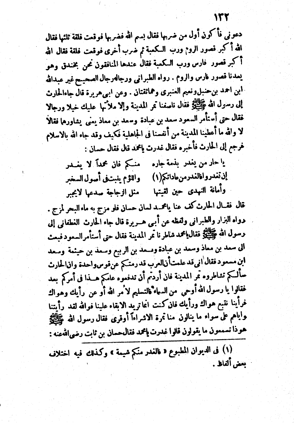قَالَ: فَقَالَ الْحَارِثُ: كُفَّ عَنَّا يَا مُحَمَّدُ لِسَانَ حَسَّانَ، فَلَوْ مُزِجَ بِهِ مَاءُ الْبَحْرِ لَمُزِجَ».