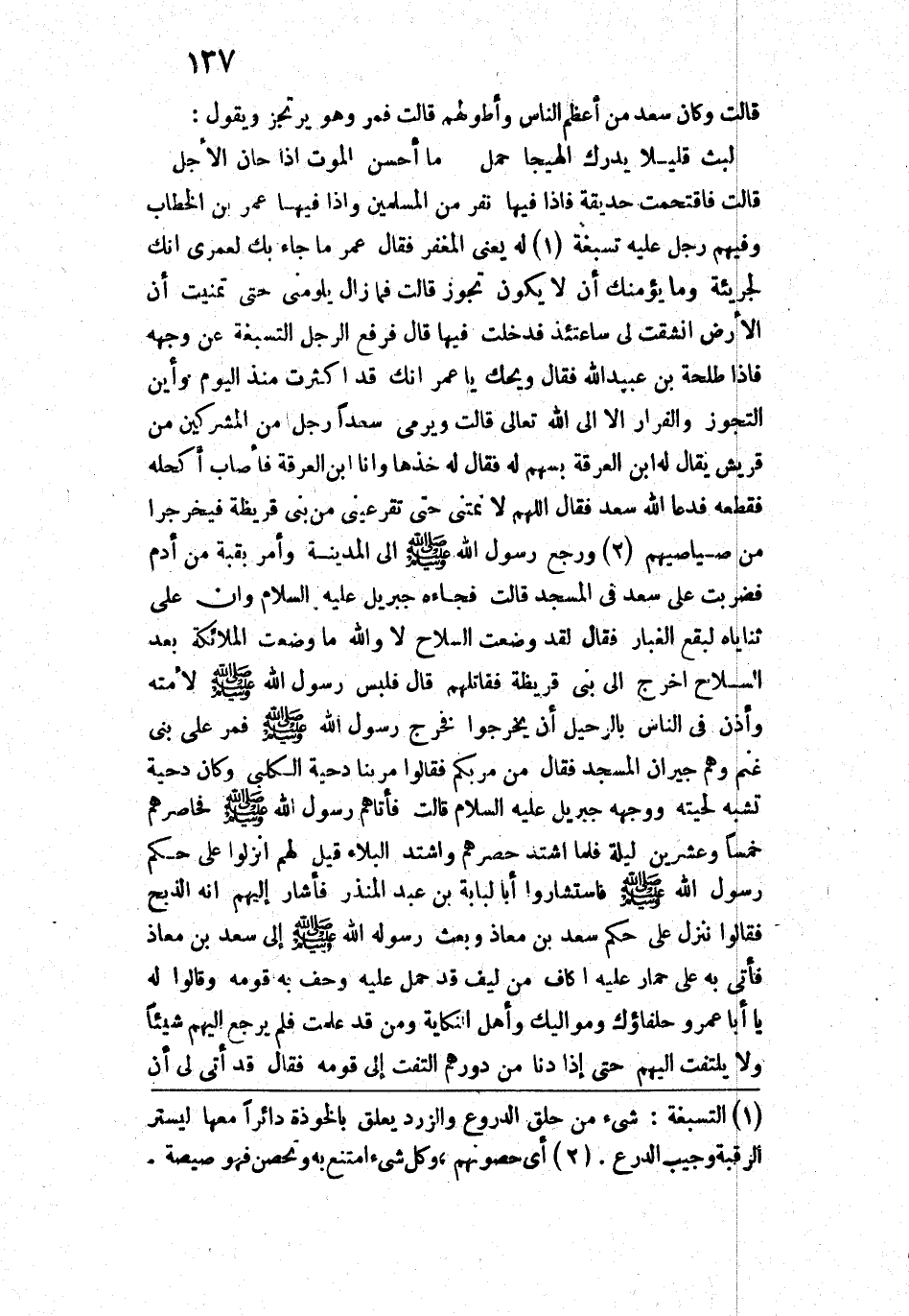 قَالَتْ: وَيَرْمِي سَعْدًا رَجُلٌ مِنَ الْمُشْرِكِينَ مِنْ قُرَيْشٍ يُقَالُ لَهُ: ابْنُ الْعَرِقَةِ بِسَهْمٍ لَهُ، فَقَالَ لَهُ: خُذْهَا وَأَنَا ابْنُ الْعَرِقَةِ فَأَصَابَ أَكْحَلَهُ فَقَطَعَهُ فَدَعَا اللَّهَ سَعْدٌ فَقَالَ: اللَّهُمَّ لَا تُمِتْنِي حَتَّى تُقِرَّ عَيْنِي مِنْ بَنِي قُرَيْظَةَ [قَالَتْ: وَكَانُوا حُلَفَاؤُهُ وَمَوَاليِهِ فِي الْجَاهِلِيَّةِ. قَالَتْ: فَرَقَى كَلِمَهُ، وَبَعَثَ اللَّهُ - عَزَّ وَجَلَّ - الرِّيحَ عَلَى الْمُشْرِكِينَ، فَكَفَى اللَّهُ - عَزَّ وَجَلَّ - الْمُؤْمِنِينَ الْقِتَالَ وَكَانَ اللَّهُ قَوِيًّا عَزِيزًا، فَلَحِقَ أَبُو سُفْيَانَ وَمَنْ مَعَهُ بِتِهَامَةَ، وَلَحِقَ عُيَيْنَةُ بْنُ بَدْرٍ وَمَنْ مَعَهُ بِنَجْدٍ، وَرَجَعَتْ بَنُو قُرَيْظَةَ فَتَحَصَّنُوا فِي] صَيَاصِيهِمْ، وَرَجَعَ رَسُولُ اللَّهِ - صَلَّى اللَّهُ عَلَيْهِ وَسَلَّمَ - إِلَى الْمَدِينَةِ، وَأَمَرَ بِقُبَّةٍ مِنْ أَدَمٍ فَضُرِبَتْ عَلَى سَعْدٍ فِي الْمَسْجِدِ.