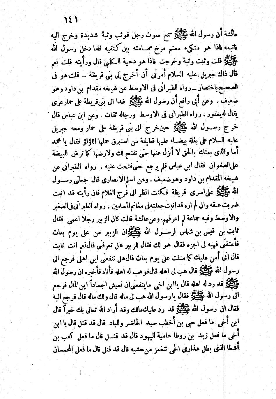 عَائِشَةَ «أَنَّ رَسُولَ اللَّهِ - صَلَّى اللَّهُ عَلَيْهِ وَسَلَّمَ - سَمِعَ صَوْتَ رَجُلٍ فَوَثَبَ وَثْبَةً شَدِيدَةً، وَخَرَجَ إِلَيْهِ، فَاتَّبَعْتُهُ فَإِذَا هُوَ مُتَّكِئٌ مُعْتَمٌّ مُرْخٍ عِمَامَتَهُ بَيْنَ كَتِفَيْهِ، فَلَمَّا دَخَلَ رَسُولُ اللَّهِ - صَلَّى اللَّهُ عَلَيْهِ وَسَلَّمَ - قُلْتُ: وَثَبْتَ وَثْبَةً وَخَرَجْتَ فَإِذَا هُوَ دِحْيَةُ الْكَلْبِيُّ، قَالَ: " وَرَأَيْتِهِ؟ "، قُلْتُ: نَعَمْ قَالَ: " ذَاكَ جِبْرِيلُ - عَلَيْهِ السَّلَامُ - أَمَرَنِي أَنْ أَخْرُجَ إِلَى بَنِي قُرَيْظَةَ».