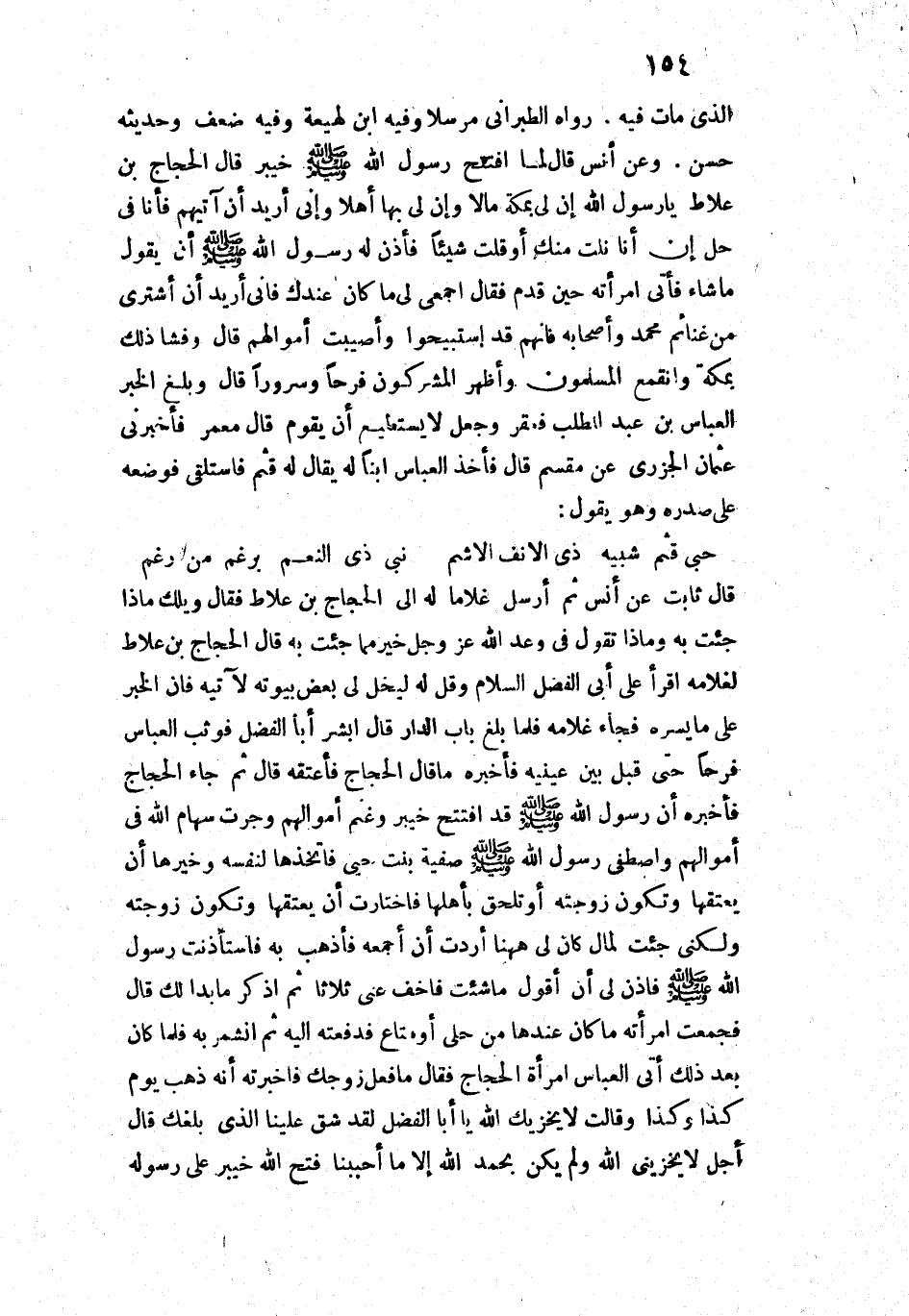 قَالَ مَعْمَرٌ: فَأَخْبَرَنِي عُثْمَانُ الْجَزَرِيُّ، عَنْ مِقْسَمٍ قَالَ: فَأَخَذَ الْعَبَّاسُ ابْنًا لَهُ يُقَالُ لَهُ: قُثَمٌ، فَاسْتَلْقَى فَوَضَعَهُ عَلَى صَدْرِهِ وَهُوَ يَقُولُ: حِبِّي قُثَمْ شَبِيهُ ذِي الْأَنْفِ الْأَشَمْ نَبِيِّ ذِي النِّعَمْ بِرَغْمٍ مِنْ رَغَمْ. قَالَ ثَابِتٌ، [عَنِ الْحَجَّاجِ] عَنْ أَنَسٍ: ثُمَّ أَرْسَلَ غُلَامًا لَهُ إِلَى الْحَجَّاجِ بْنِ عِلَاطٍ، فَقَالَ: وَيْلَكَ مَاذَا جِئْتَ بِهِ؟ وَمَاذَا تَقُولُ؟ فَمَا وَعَدَ اللَّهُ عَزَّ وَجَلَّ خَيْرٌ مِمَّا جِئْتَ بِهِ. قَالَ الْحَجَّاجُ بْنُ عِلَاطٍ لِغُلَامِهِ: اقْرَأْ عَلَى أَبِي الْفَضْلِ السَّلَامَ، وَقُلْ لَهُ لِيُخَلِّ لِي [فِي] بَعْضَ بُيُوتِهِ لِآتِيَهُ، فَإِنَّ الْخَبَرَ عَلَى مَا يَسُرُّهُ، فَجَاءَ غُلَامُهُ فَلَمَّا بَلَغَ بَابَ الدَّارِ، قَالَ: أَبْشِرْ أَبَا الْفَضْلِ قَالَ: فَوَثَبَ الْعَبَّاسُ فَرِحًا حَتَّى قَبَّلَ بَيْنَ عَيْنَيْهِ، فَأَخْبَرَهُ مَا قَالَ الْحَجَّاجُ فَأَعْتَقَهُ، قَالَ: ثُمَّ جَاءَ الْحَجَّاجُ فَأَخْبَرَهُ أَنَّ رَسُولَ اللَّهِ - صَلَّى اللَّهُ عَلَيْهِ وَسَلَّمَ - قَدِ افْتَتَحَ خَيْبَرَ، وَغَنِمَ أَمْوَالَهُمْ، وَجَرَتْ سِهَامُ اللَّهِ فِي أَمْوَالِهِمْ، وَاصْطَفَى رَسُولُ اللَّهِ صَفِيَّةَ بِنْتَ حُيَيٍّ فَاتَّخَذَهَا لِنَفْسِهِ، وَخَيَّرَهَا أَنْ يُعْتِقَهَا وَتَكُونَ زَوْجَتَهُ، أَوْ تَلْحَقَ بِأَهْلِهَا، فَاخْتَارَتْ أَنْ يُعْتِقَهَا وَتَكُونَ زَوْجَتَهُ، وَلَكِنِّي جِئْتُ لِمَالٍ كَانَ لِي هَهُنَا أَرَدْتُ أَنْ أَجْمَعَهُ فَأَذْهَبَ بِهِ، فَاسْتَأْذَنْتُ رَسُولَ اللَّهِ - صَلَّى اللَّهُ عَلَيْهِ وَسَلَّمَ - فَأَذِنَ لِي أَنْ أَقُولَ مَا شِئْتُ، فَأَخْفِ عَنِّي ثَلَاثًا ثُمَّ اذْكُرْ مَا بَدَا لَكَ.