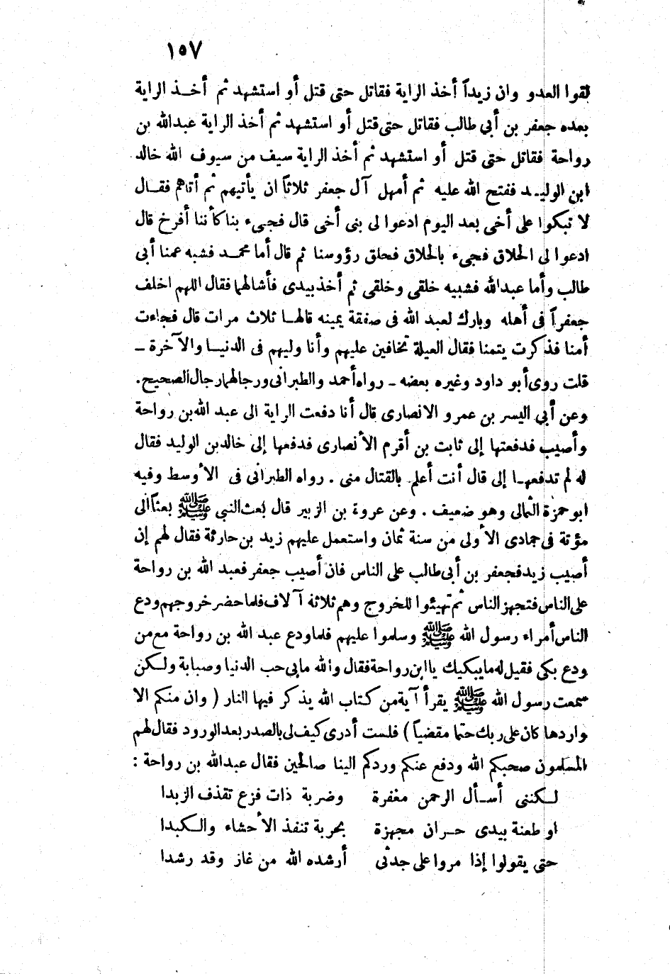 ثُمَّ أَخَذَ الرَّايَةَ عَبْدُ اللَّهِ بْنُ رَوَاحَةَ فَقَاتَلَ حَتَّى قُتِلَ أَوِ اسْتُشْهِدَ، ثُمَّ أَخَذَ الرَّايَةَ سَيْفٌ مِنْ سُيُوفِ اللَّهِ خَالِدُ بْنُ الْوَلِيدِ فَفَتَحَ اللَّهُ عَلَيْهِ " [فَأَمْهَلَ].