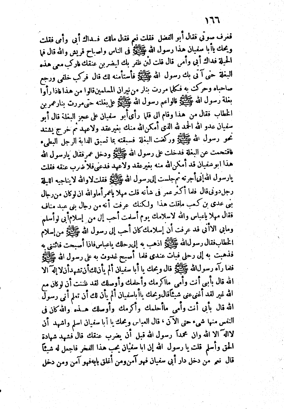 حَتَّى مَرَرْتُ بِنَارِ عُمَرَ بْنِ الْخَطَّابِ، فَقَالَ: مَنْ هَذَا؟ وَقَامَ إِلَيَّ، فَلَمَّا رَأَى أَبَا سُفْيَانَ عَلَى عَجُزِ الْبَغْلَةِ قَالَ: أَبُو سُفْيَانَ عَدُوُّ اللَّهِ؟! الْحَمْدُ لِلَّهِ الَّذِي أَمْكَنَ اللَّهُ مِنْكَ بِغَيْرِ عَقْدٍ وَلَا عَهْدٍ، ثُمَّ خَرَجَ يَشْتَدُّ نَحْوَ رَسُولِ اللَّهِ - صَلَّى اللَّهُ عَلَيْهِ وَسَلَّمَ - وَرَكَضَتِ الْبَغْلَةُ فَسَبَقْتُهُ بِمَا تَسْبِقُ الدَّابَّةُ الرَّجُلَ الْبَطِيءَ، فَاقْتَحَمْتُ عَنِ الْبَغْلَةِ، فَدَخَلْتُ عَلَى رَسُولِ اللَّهِ - صَلَّى اللَّهُ عَلَيْهِ وَسَلَّمَ - وَدَخَلَ عُمَرُ، فَقَالَ: يَا رَسُولَ اللَّهِ، هَذَا أَبُو سُفْيَانَ قَدْ أَمْكَنَ اللَّهُ مِنْهُ بِغَيْرِ عَقْدٍ وَلَا عَهْدٍ فَدَعْنِي فَلْأَضْرِبْ عُنُقَهُ، فَقُلْتُ: يَا رَسُولَ اللَّهِ، إِنِّي أَجَرْتُهُ، ثُمَّ جَلَسْتُ إِلَى رَسُولِ اللَّهِ - صَلَّى اللَّهُ عَلَيْهِ وَسَلَّمَ -[فَأَخَذْتُ بِرَأْسِهِ] فَقُلْتُ: لَا وَاللَّهِ لَا يُنَاجِيهِ اللَّيْلَةَ رَجُلٌ دُونِي. قَالَ: فَلَمَّا أَكْثَرَ عُمَرُ فِي شَأْنِهِ قُلْتُ: مَهْلًا يَا عُمَرُ، أَمَا وَاللَّهِ أَنْ لَوْ كَانَ مِنْ رِجَالِ بَنِي عَدِيِّ بْنِ كَعْبٍ مَا قُلْتَ هَذَا، وَلَكِنَّكَ عَرَفْتَ أَنَّهُ مِنْ رِجَالِ بَنِي عَبْدِ مَنَافٍ، فَقَالَ: مَهْلًا يَا عَبَّاسُ، وَاللَّهِ لَإِسْلَامُكَ يَوْمَ أَسْلَمْتَ أَحَبُّ إِلَيَّ مِنْ إِسْلَامِ أَبِي لَوْ أَسْلَمَ، وَمَا بِي إِلَّا أَنِّي قَدْ عَرَفْتُ أَنَّ إِسْلَامَكَ كَانَ أَحَبَّ إِلَى رَسُولِ اللَّهِ - صَلَّى اللَّهُ عَلَيْهِ وَسَلَّمَ - مِنْ إِسْلَامِ الْخَطَّابِ.