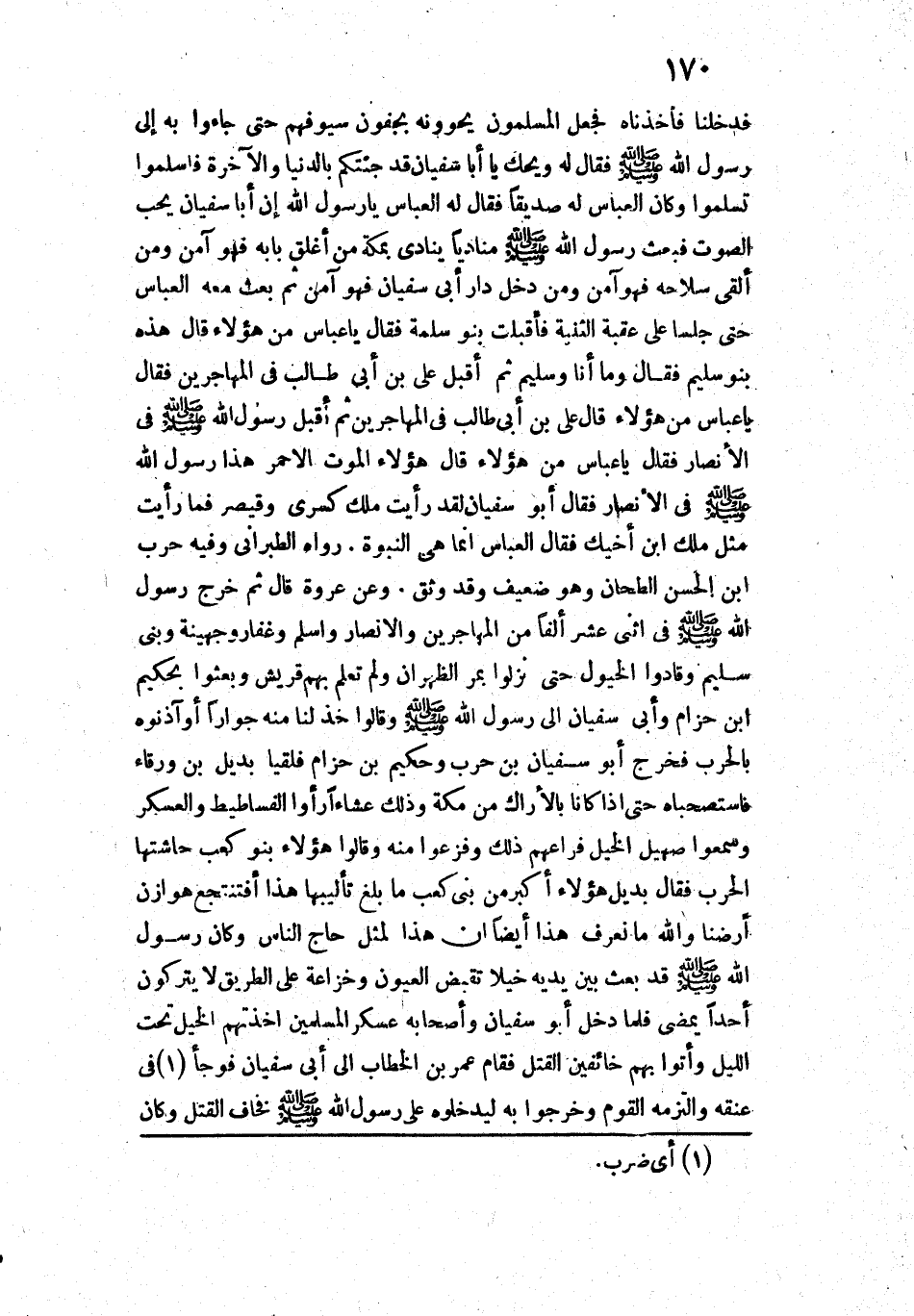 فَلَمَّا دَخَلَ أَبُو سُفْيَانَ وَأَصْحَابُهُ عَسْكَرَ الْمُسْلِمِينَ أَخَذَتْهُمُ الْخَيْلُ تَحْتَ اللَّيْلِ، وَأَتَوْا بِهِمْ خَائِفِينَ الْقَتْلَ، فَقَامَ عُمَرُ بْنُ الْخَطَّابِ إِلَى أَبِي سُفْيَانَ فَوَجَأَهُ فِي عُنُقِهِ، وَالْتَزَمَهُ الْقَوْمُ وَخَرَجُوا بِهِ لِيُدْخِلُوهُ عَلَى رَسُولِ اللَّهِ - صَلَّى اللَّهُ عَلَيْهِ وَسَلَّمَ - فَخَافَ الْقَتْلَ. وَكَانَ