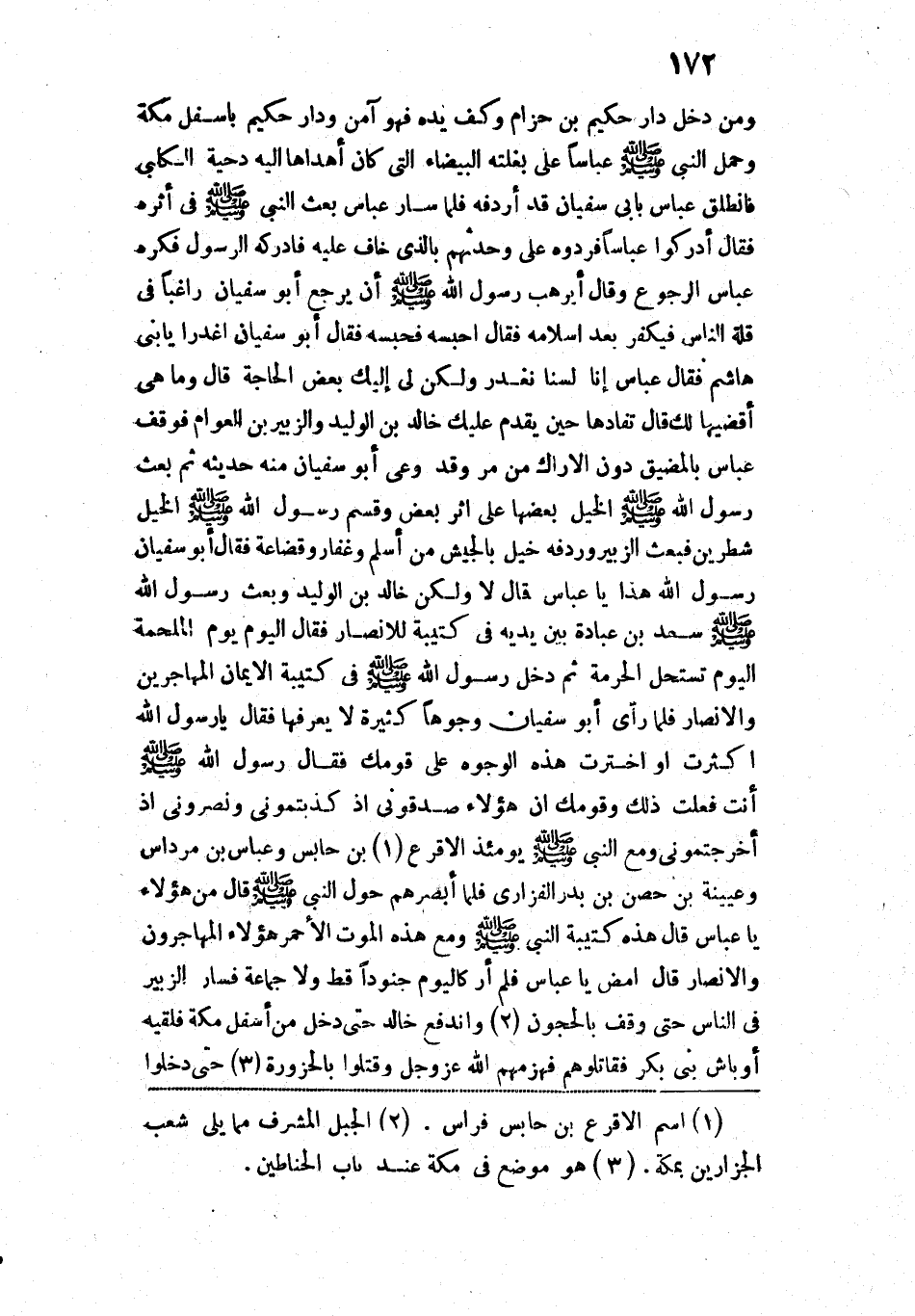 وَحَدَّثَهُمْ بِالَّذِي خَافَ عَلَيْهِ فَأَدْرَكَهُ الرَّسُولُ فَكَرِهَ عَبَّاسٌ الرُّجُوعَ وَقَالَ: أَيَرْهَبُ رَسُولُ اللَّهِ - صَلَّى اللَّهُ عَلَيْهِ وَسَلَّمَ - أَنْ يَرْجِعَ أَبُو سُفْيَانَ رَاغِبًا فِي قِلَّةِ النَّاسِ فَيَكْفُرَ بَعْدَ إِسْلَامِهِ؟، فَقَالَ: احْبِسْهُ. فَحَبَسَهُ، فَقَالَ أَبُو سُفْيَانَ: أَغَدْرًا يَا بَنِي هَاشِمٍ، فَقَالَ عَبَّاسٌ: إِنَّا لَسْنَا نَغْدِرُ، وَلَكِنَّ لِي إِلَيْكَ بَعْضَ الْحَاجَةِ، قَالَ: وَمَا هِيَ أَقْضِيهَا لَكَ؟ قَالَ: تُفَادِهَا حِينَ يَقْدَمُ عَلَيْكَ خَالِدُ بْنُ الْوَلِيدِ وَالزُّبَيْرُ بْنُ الْعَوَّامِ، فَوَقَفَ عَبَّاسٌ بِالْمَضِيقِ دُونَ الْأَرَاكِ مِنْ مَرٍّ، وَقَدْ وَعَى أَبُو سُفْيَانَ مِنْهُ حَدِيثَهُ، ثُمَّ بَعَثَ رَسُولُ اللَّهِ - صَلَّى اللَّهُ عَلَيْهِ وَسَلَّمَ - الْخَيْلَ بَعْضَهَا عَلَى أَثَرِ بَعْضٍ، وَقَسَمَ رَسُولُ اللَّهِ - صَلَّى اللَّهُ عَلَيْهِ وَسَلَّمَ - الْخَيْلَ شَطْرَيْنِ فَبَعَثَ الزُّبَيْرَ، وَرَدِفَهُ خَالِدُ بْنُ الْوَلِيدِ بِالْجَيْشِ مِنْ أَسْلَمَ وَغِفَارٍ وَقُضَاعَةَ، فَقَالَ أَبُو سُفْيَانَ: رَسُولُ اللَّهِ هَذَا يَا عَبَّاسُ؟ قَالَ: لَا، وَلَكِنْ خَالِدُ بْنُ الْوَلِيدِ وَبَعَثَ رَسُولُ اللَّهِ - صَلَّى اللَّهُ عَلَيْهِ وَسَلَّمَ - سَعْدَ بْنَ عُبَادَةَ بَيْنَ يَدَيْهِ فِي كَتِيبَةٍ مِنَ الْأَنْصَارِ، فَقَالَ: " الْيَوْمَ يَوْمُ الْمَلْحَمَةِ الْيَوْمَ تُسْتَحَلُّ الْحُرُمَةُ ".