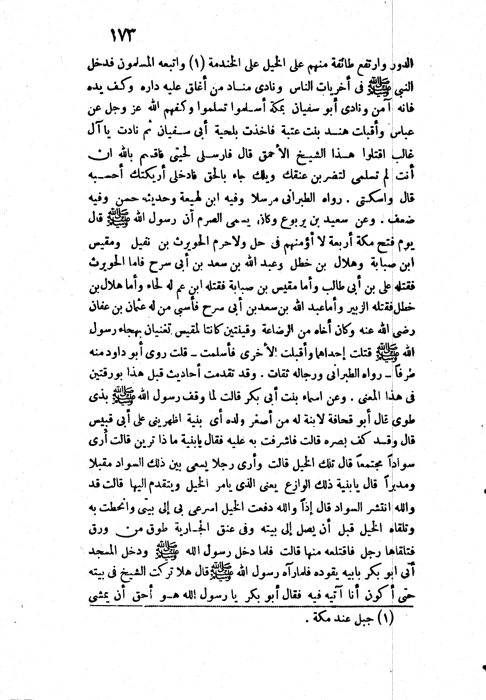 وَنَادَى أَبُو سُفْيَانَ بِمَكَّةَ: أَسْلِمُوا تَسْلَمُوا، وَكَفَّهُمُ اللَّهُ عَزَّ وَجَلَّ عَنْ عَبَّاسٍ. وَأَقْبَلَتْ هِنْدُ بِنْتُ عُتْبَةَ فَأَخَذَتْ بِلِحْيَةِ أَبِي سُفْيَانَ ثُمَّ نَادَتْ: يَا آلَ غَالِبٍ اقْتُلُوا هَذَا الشَّيْخَ الْأَحْمَقَ. قَالَ: فَأَرْسِلِي لِحْيَتِي، فَأُقْسِمُ بِاللَّهِ إِنْ أَنْتِ لَمْ تُسْلِمِي لَتُضْرَبَنَّ عُنُقُكِ، وَيْلَكِ جَاءَ بِالْحَقِّ فَادْخُلِي أَرِيكَتَكِ - أَحْسَبُهُ قَالَ: - وَاسْكُتِي».