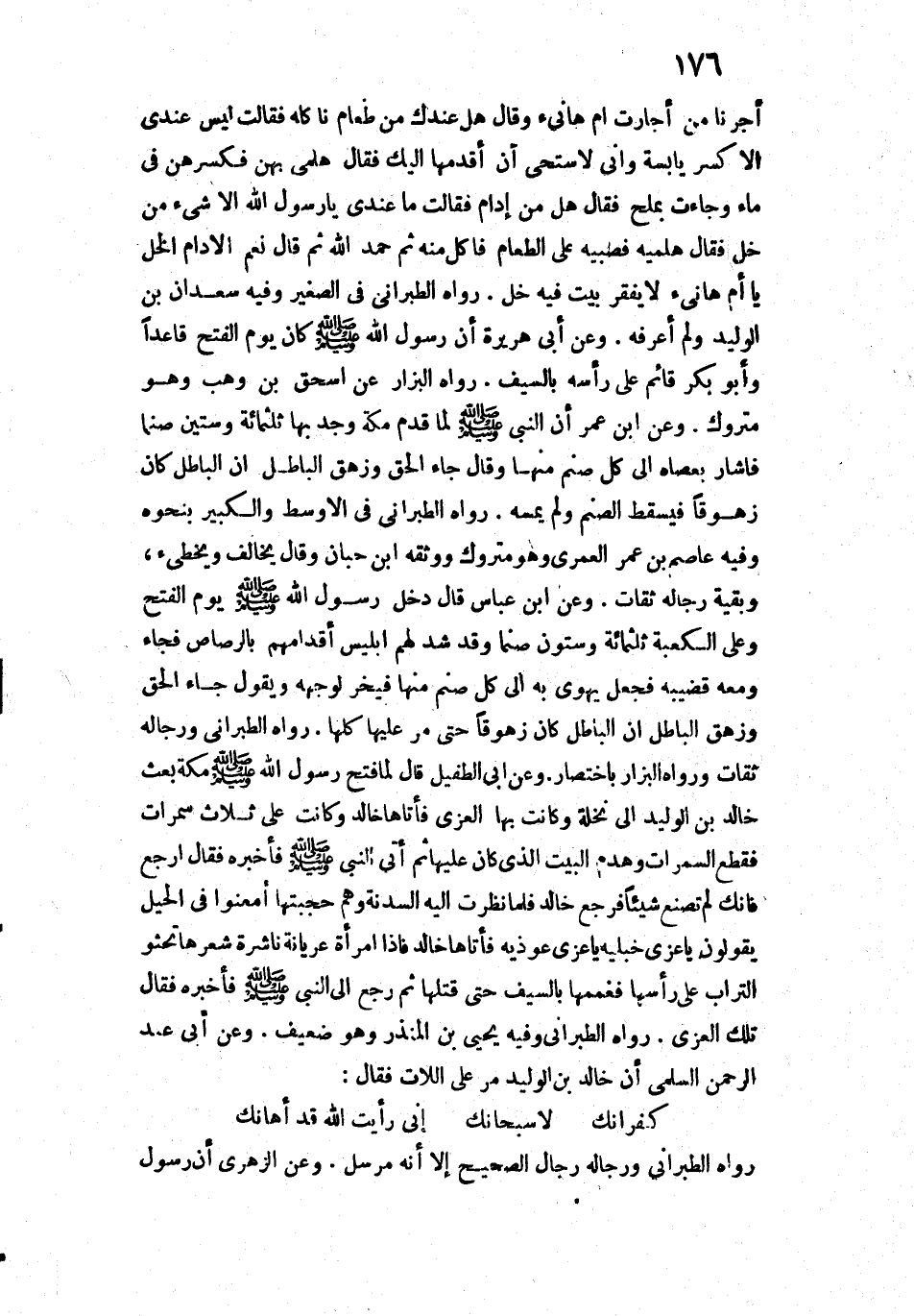 فَرَجَعَ خَالِدٌ فَلَمَّا نَظَرَتْ إِلَيْهِ السَّدَنَةُ وَهُمْ حَجَبَتُهَا أَمْعَنُوا فِي الْجِبَلِ، يَقُولُونَ: يَا عُزَّى خَبِّلِيهِ، يَا عُزَّى عَوِّرِيهِ، فَأَتَاهُ خَالِدٌ فَإِذَا امْرَأَةٌ عُرْيَانَةٌ نَاشِرَةٌ شَعْرَهَا تَحْثُو التُّرَابَ عَلَى رَأْسِهَا، فَغَمَّمَهَا بِالسَّيْفِ حَتَّى قَتَلَهَا ثُمَّ رَجَعَ إِلَى النَّبِيِّ - صَلَّى اللَّهُ عَلَيْهِ وَسَلَّمَ - فَأَخْبَرَهُ، فَقَالَ: " تِلْكَ الْعُزَّى» ".