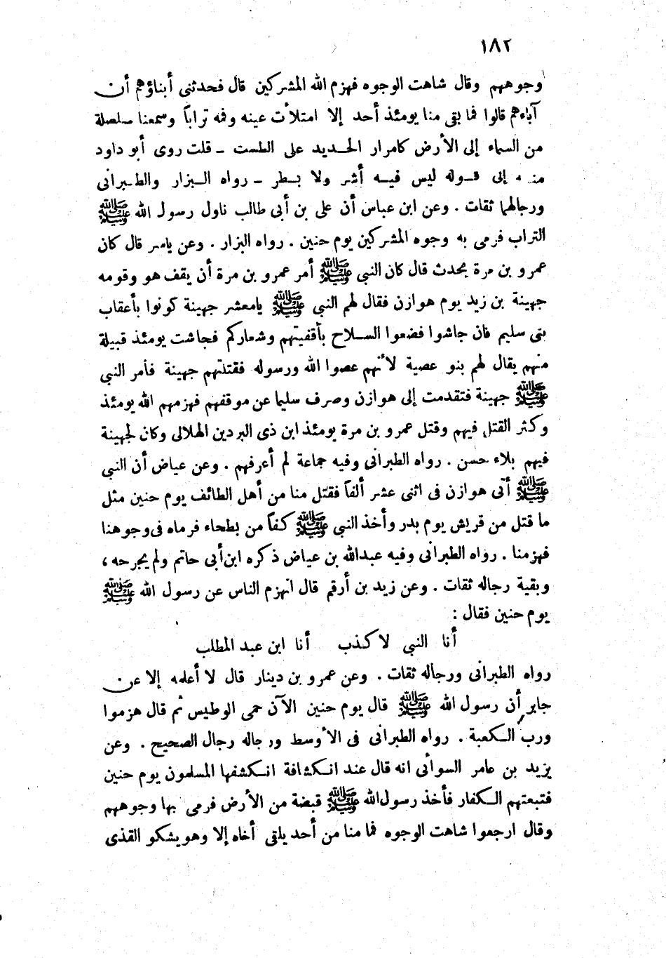 10276 - وَعَنْ زَيْدِ بْنِ أَرْقَمَ قَالَ: «انْهَزَمَ النَّاسُ عَنْ رَسُولِ اللَّهِ - صَلَّى اللَّهُ عَلَيْهِ وَسَلَّمَ - يَوْمَ حُنَيْنٍ فَقَالَ: " أَنَا النَّبِيُّ لَا كَذِبْ أَنَا ابْنُ عَبْدِ الْمُطَّلِبْ ".»