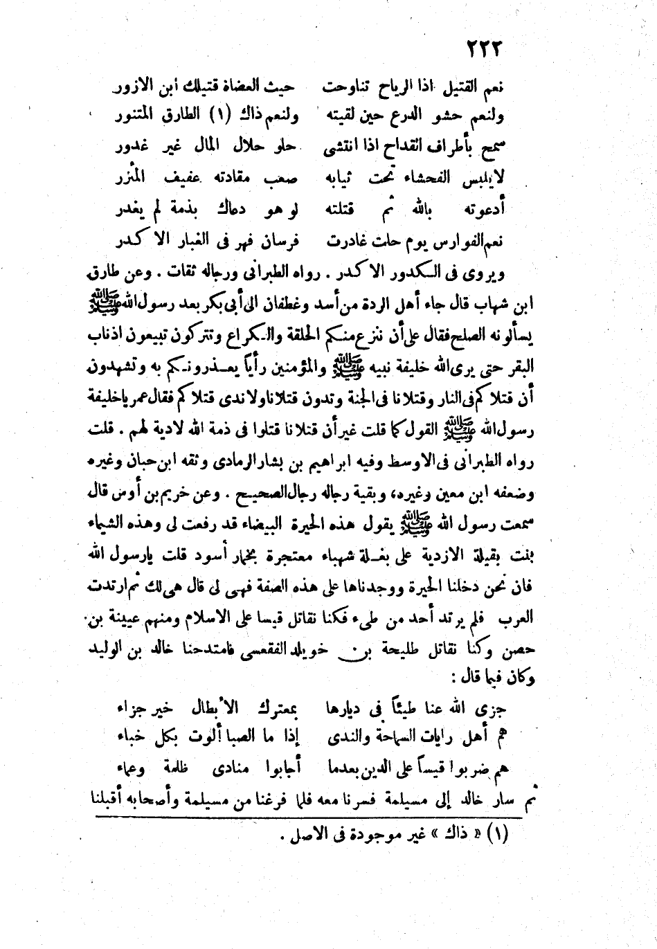 ثُمَّ ارْتَدَتِ الْعَرَبُ فَلَمْ يَرْتَدَّ أَحَدٌ مِنْ طَيِّءٍ، فَكُنَّا نُقَاتِلُ قَيْسًا عَلَى الْإِسْلَامِ، وَمِنْهُمْ عُيَيْنَةُ بْنُ حِصْنٍ، وَكُنَّا نُقَاتِلُ طُلَيْحَةَ بْنَ خُوَيْلِدٍ الْفَقْعَسِيَّ، فَامْتَدَحَنَا خَالِدُ بْنُ الْوَلِيدِ، وَكَانَ فِيمَا قَالَ: