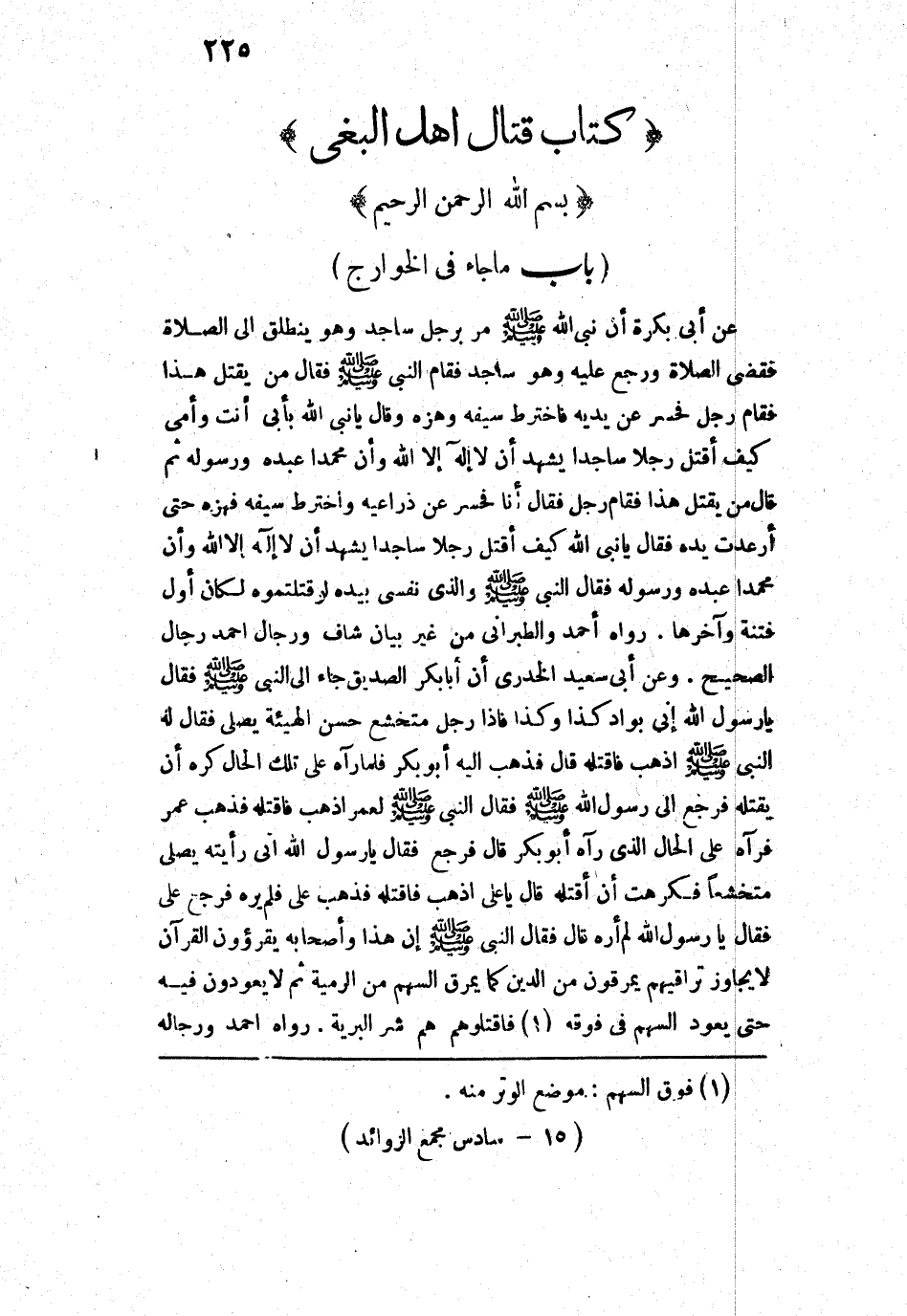 قَالَ: فَقَالَ النَّبِيُّ - صَلَّى اللَّهُ عَلَيْهِ وَسَلَّمَ -: " إِنَّ هَذَا وَأَصْحَابَهُ يَقْرَءُونَ الْقُرْآنَ لَا يُجَاوِزُ تَرَاقِيَهُمْ، يَمْرُقُونَ مِنَ الدِّينِ كَمَا يَمْرُقُ السَّهْمُ مِنَ الرَّمِيَّةِ، ثُمَّ لَا يَعُودُونَ فِيهِ حَتَّى يَعُودَ السَّهْمُ فِي فَوْقِهِ، فَاقْتُلُوهُمْ، هُمْ شَرُّ الْبَرِيَّةِ».