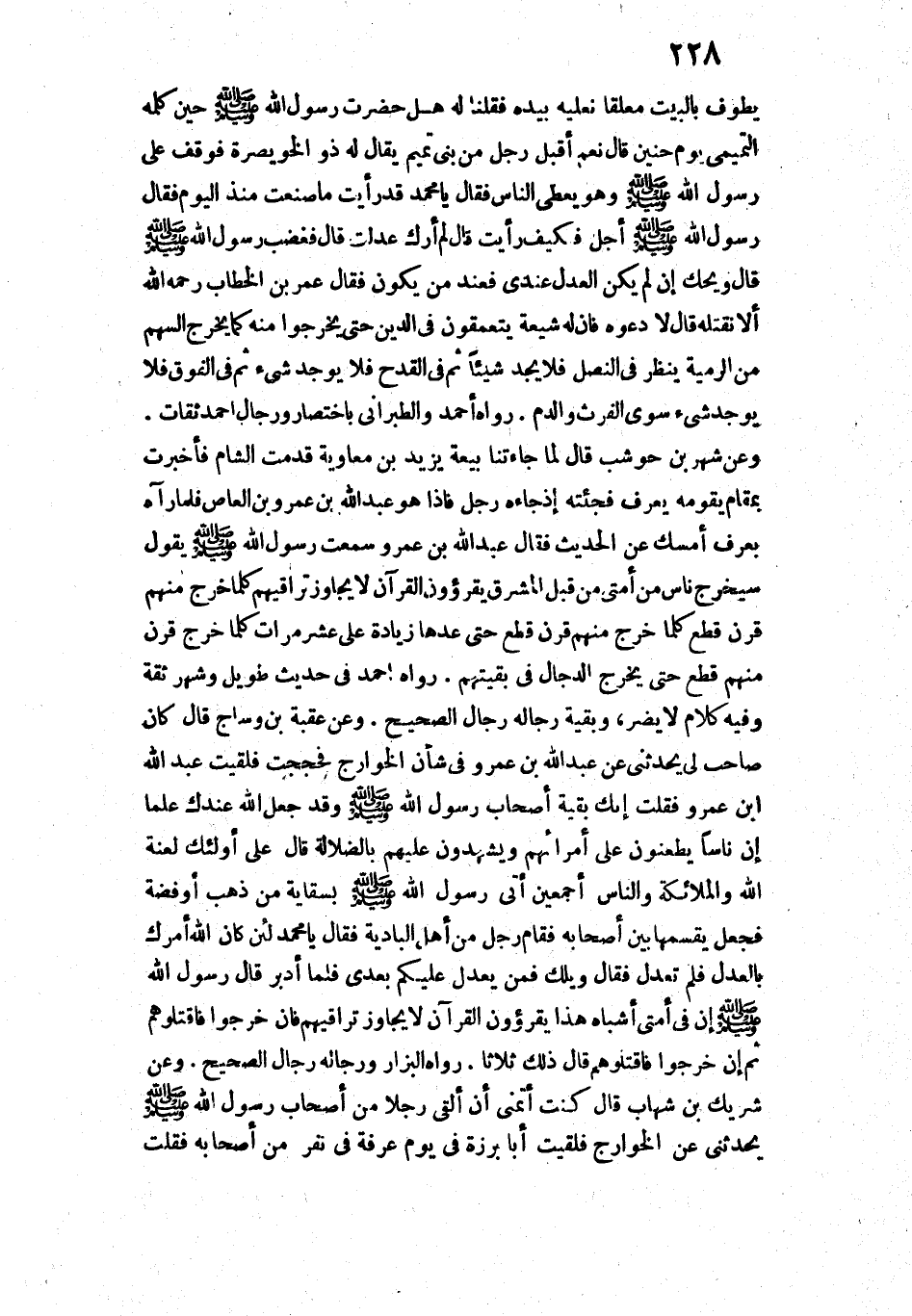 يَطُوفُ بِالْبَيْتِ مُعَلِّقًا نَعْلَيْهِ بِيَدِهِ، فَقُلْنَا لَهُ: هَلْ حَضَرْتَ رَسُولَ اللَّهِ - صَلَّى اللَّهُ عَلَيْهِ وَسَلَّمَ - حِينَ كَلَّمَهُ التَّمِيمِيُّ يَوْمَ حُنَيْنٍ؟ قَالَ: نَعَمْ، أَقْبَلَ رَجُلٌ مِنْ بَنِي تَمِيمٍ يُقَالُ لَهُ: ذُو الْخُوَيْصِرَةِ، فَوَقَفَ عَلَى رَسُولِ اللَّهِ - صَلَّى اللَّهُ عَلَيْهِ وَسَلَّمَ - وَهُوَ يُعْطِي النَّاسَ، فَقَالَ: يَا مُحَمَّدُ، قَدْ رَأَيْتُ مَا صَنَعْتَ مُنْذُ الْيَوْمِ. فَقَالَ رَسُولُ اللَّهِ - صَلَّى اللَّهُ عَلَيْهِ وَسَلَّمَ -: " أَجَلْ، فَكَيْفَ رَأَيْتَ؟ ". قَالَ: لَمْ أَرَكَ عَدَلْتَ. قَالَ: فَغَضِبَ رَسُولُ اللَّهِ - صَلَّى اللَّهُ عَلَيْهِ وَسَلَّمَ - ثُمَّ قَالَ: " وَيْحَكَ، إِنْ لَمْ يَكُنِ الْعَدْلُ عِنْدِي، فَعِنْدَ مَنْ يَكُونُ؟ ". فَقَالَ عُمَرُ بْنُ الْخَطَّابِ رَحِمَهُ اللَّهُ: يَا رَسُولَ اللَّهِ، أَلَا نَقْتُلُهُ؟ قَالَ: " لَا، دَعُوهُ، فَإِنَّ لَهُ شِيعَةً يَتَعَمَّقُونَ فِي الدِّينِ حَتَّى يَخْرُجُوا مِنْهُ كَمَا يَخْرُجُ السَّهْمُ مِنَ الرَّمِيَّةِ يَنْظُرُ فِي النَّصْلِ فَلَا يَجِدُ شَيْئًا، ثُمَّ فِي الْقَدَحِ فَلَا يُوجَدُ شَيْءٌ، ثُمَّ فِي الْفَوْقِ فَلَا يُوجَدُ شَيْءٌ سِوَى الْفَرْثِ وَالدَّمِ».