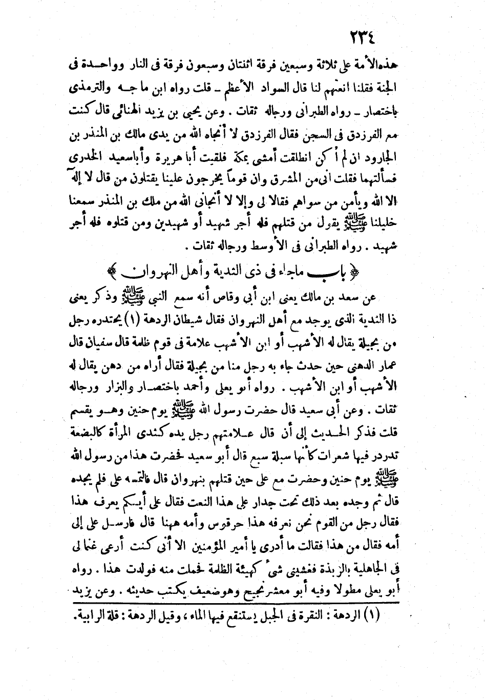 هَذِهِ الْأُمَّةُ عَلَى ثَلَاثَةٍ وَسَبْعِينَ فِرْقَةً، اثْنَتَانِ وَسَبْعُونَ فِرْقَةً فِي النَّارِ، وَوَاحِدَةٌ فِي الْجَنَّةِ. فَقُلْنَا: انْعَتْهُمْ لَنَا، قَالَ: السَّوَادُ الْأَعْظَمُ.