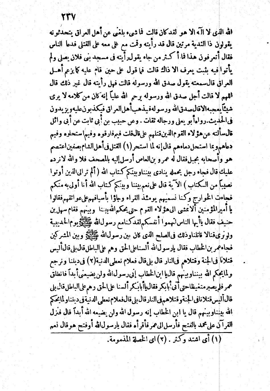 فَجَاءَتِ الْخَوَارِجُ، وَكُنَّا نُسَمِّيهِمْ يَوْمَئِذٍ الْقُرَّاءَ، وَجَاءُوا بِأَسْيَافِهِمْ عَلَى عَوَاتِقِهِمْ، فَقَالُوا: يَا أَمِيرَ الْمُؤْمِنِينَ، أَلَا نَمْشِي إِلَى هَؤُلَاءِ الْقَوْمِ حَتَّى يَحْكُمَ اللَّهُ بَيْنَنَا وَبَيْنَهُمْ؟. فَقَامَ سَهْلُ بْنُ حُنَيْفٍ، قَالَ: يَا أَيُّهَا النَّاسُ، اتَّهِمُوا أَنْفُسَكُمْ، «لَقَدْ كُنَّا مَعَ رَسُولِ اللَّهِ - صَلَّى اللَّهُ عَلَيْهِ وَسَلَّمَ - يَوْمَ الْحُدَيْبِيَةِ وَلَوْ نَرَى قِتَالًا قَاتَلْنَا، وَذَلِكَ فِي الصُّلْحِ الَّذِي كَانَ بَيْنَ رَسُولِ اللَّهِ - صَلَّى اللَّهُ عَلَيْهِ وَسَلَّمَ - وَبَيْنَ الْمُشْرِكِينَ، فَجَاءَ عُمَرُ بْنُ الْخَطَّابِ، فَقَالَ: يَا رَسُولَ اللَّهِ، أَلَسْنَا عَلَى الْحَقِّ وَهُمْ عَلَى الْبَاطِلِ؟ قَالَ: " بَلَى ". قَالَ: أَلَيْسَ قَتْلَانَا فِي الْجَنَّةِ وَقَتْلَاهُمْ فِي النَّارِ؟ قَالَ: " بَلَى ". قَالَ: فَعَلَامَ نُعْطِي الدَّنِيَّةَ فِي دِينِنَا، وَنَرْجِعُ وَلَمَّا يَحْكُمِ اللَّهُ بَيْنَنَا وَبَيْنَهُمْ؟ قَالَ: " يَا ابْنَ الْخَطَّابِ، إِنِّي رَسُولُ اللَّهِ وَلَنْ يُضَيِّعَنِي أَبَدًا ".