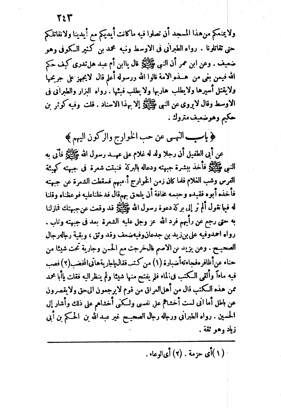 10456 - عَنْ أَبِي الطُّفَيْلِ «أَنَّ رَجُلًا وُلِدَ لَهُ غُلَامٌ عَلَى عَهْدِ رَسُولِ اللَّهِ - صَلَّى اللَّهُ عَلَيْهِ وَسَلَّمَ - فَأَتَى بِهِ النَّبِيَّ - صَلَّى اللَّهُ عَلَيْهِ وَسَلَّمَ - فَأَخَذَ بِبَشَرَةِ جَبْهَتِهِ، وَدَعَا لَهُ بِالْبَرَكَةِ، فَنَبَتَتْ شَعْرَةٌ فِي جَبْهَتِهِ كَهْلَبَةُ الْفَرَسِ». وَشَبَّ الْغُلَامُ، فَلَمَّا كَانَ زَمَنُ الْخَوَارِجِ أَحَبَّهُمْ ; فَسَقَطَتِ الشَّعْرَةُ عَنْ جَبْهَتِهِ، فَأَخَذَهُ أَبُوهُ فَقَيَّدَهُ وَحَبَسَهُ مَخَافَةَ أَنْ يَلْحَقَ بِهِمْ، قَالَ: فَدَخَلْنَا عَلَيْهِ، فَوَعَظْنَاهُ وَقُلْنَا لَهُ فِيمَا نَقُولُ: أَلَمْ تَرَ إِلَى بَرَكَةِ دَعْوَةِ رَسُولِ اللَّهِ - صَلَّى اللَّهُ عَلَيْهِ وَسَلَّمَ - قَدْ وَقَعَتْ عَنْ جَبْهَتِكَ؟ فَمَا زِلْنَا بِهِ حَتَّى رَجَعَ عَنْ رَأْيِهِمْ، فَرَدَّ اللَّهُ عَزَّ وَجَلَّ عَلَيْهِ الشَّعْرَةَ بَعْدُ فِي جَبْهَتِهِ وَتَابَ.