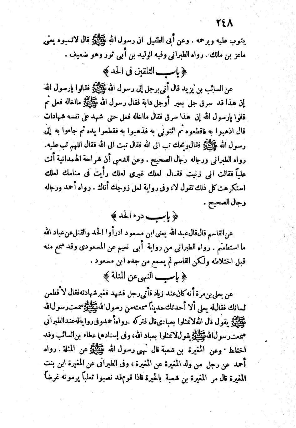 10486 - عَنِ السَّائِبِ بْنِ يَزِيدَ قَالَ: «أُتِيَ بِرَجُلٍ إِلَى رَسُولِ اللَّهِ - صَلَّى اللَّهُ عَلَيْهِ وَسَلَّمَ - فَقَالُوا: يَا رَسُولَ اللَّهِ، إِنَّ هَذَا قَدْ سَرَقَ جُلَّ بَعِيرٍ - أَوْ جُلَّ دَابَّةٍ - فَقَالَ رَسُولُ اللَّهِ - صَلَّى اللَّهُ عَلَيْهِ وَسَلَّمَ -: " مَا أَخَالُهُ فَعَلَ ". ثُمَّ قَالُوا: يَا رَسُولَ اللَّهِ، إِنَّ هَذَا سَرَقَ، فَقَالَ: " مَا أَخَالُهُ فَعَلَ ". حَتَّى شَهِدَ عَلَى نَفْسِهِ شَهَادَاتٍ. قَالَ: " اذْهَبُوا بِهِ فَاقْطَعُوهُ ثُمَّ ائْتُونِي بِهِ ". فَذَهَبُوا بِهِ فَقَطَعُوا يَدَهُ، ثُمَّ جَاءُوا بِهِ إِلَى رَسُولِ اللَّهِ - صَلَّى اللَّهُ عَلَيْهِ وَسَلَّمَ - فَقَالَ: " وَيْحَكَ تُبْ إِلَى اللَّهِ ". فَقَالَ: تُبْتُ إِلَى اللَّهِ، فَقَالَ: " اللَّهُمَّ تُبْ عَلَيْهِ».