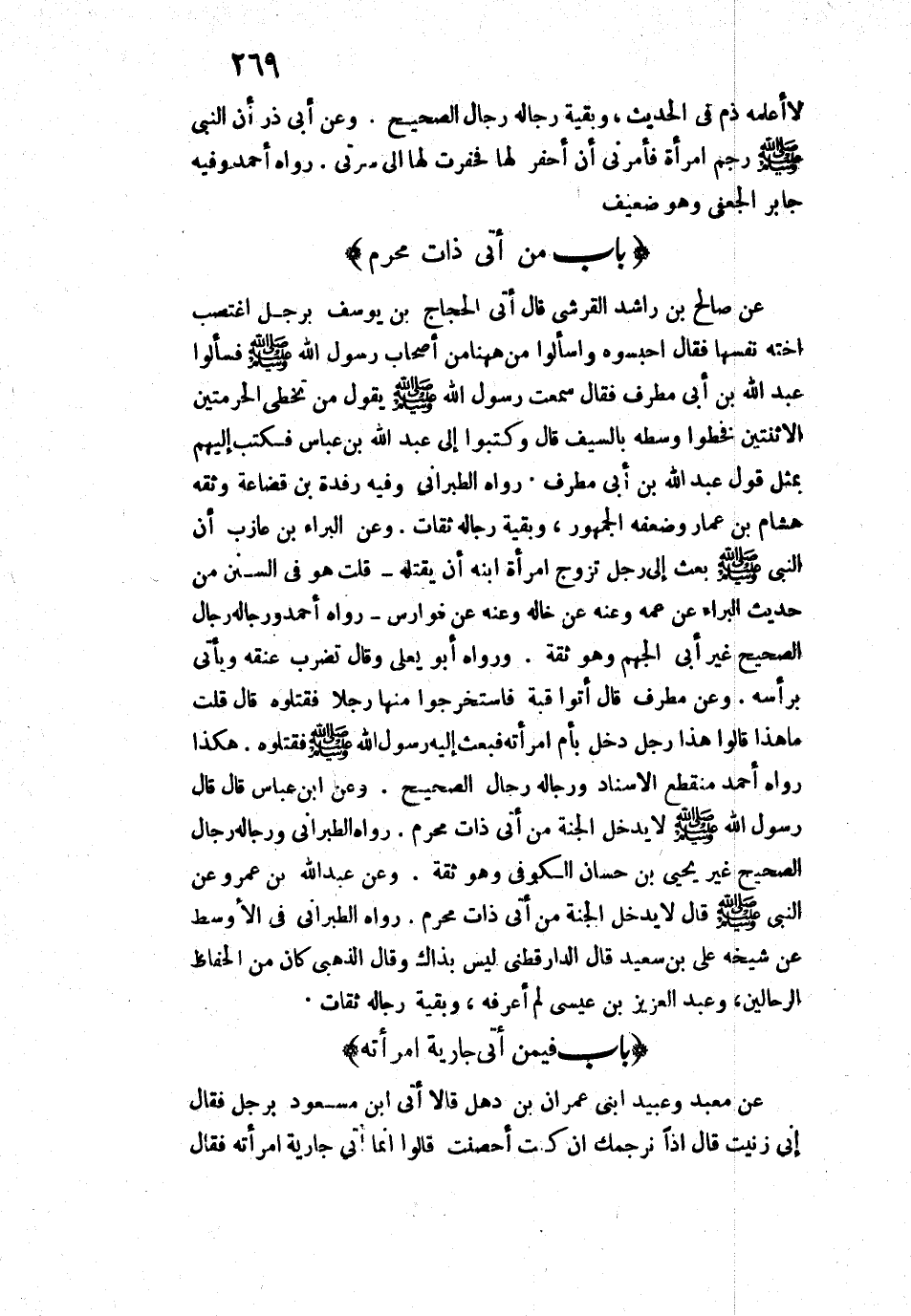 10619 - وَعَنْ مُطَرِّفٍ قَالَ: «أَتَوْا قُبَّةً فَاسْتَخْرَجُوا مِنْهَا رَجُلًا فَقَتَلُوهُ، قَالَ: قُلْتُ: مَا هَذَا؟ قَالُوا: هَذَا رَجُلٌ دَخَلَ بِأُمِّ امْرَأَتِهِ، فَبَعَثَ إِلَيْهِ رَسُولُ اللَّهِ - صَلَّى اللَّهُ عَلَيْهِ وَسَلَّمَ - فَقَتَلُوهُ». هَكَذَا رَوَاهُ أَحْمَدُ مُنْقَطِعَ الْإِسْنَادِ، وَرِجَالُهُ رِجَالُ الصَّحِيحِ.