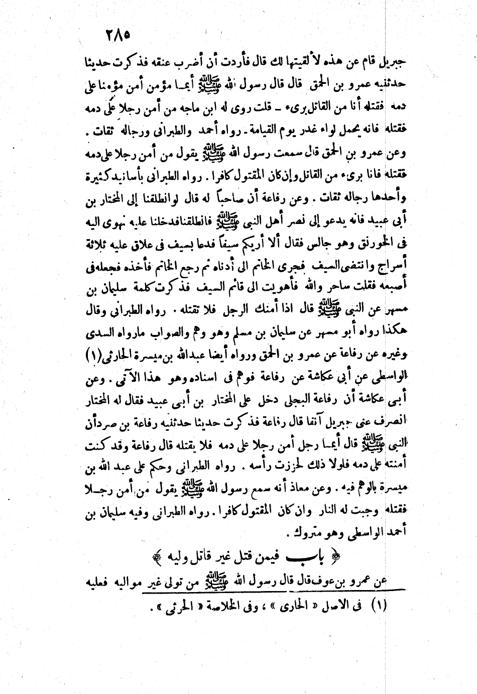 جِبْرِيلُ قَامَ عَنْ هَذِهِ لَأَلْقَيْتُهَا لَكَ. قَالَ: فَأَرَدْتُ أَنْ أَضْرِبَ عُنُقَهُ، فَذَكَرْتُ حَدِيثًا حَدَّثَنِيهِ عَمْرُو بْنُ الْحَمِقِ قَالَ: قَالَ رَسُولُ اللَّهِ - صَلَّى اللَّهُ عَلَيْهِ وَسَلَّمَ -: " «أَيُّمَا مُؤْمِنٍ أَمَّنَ مُؤْمِنًا عَلَى دَمِهِ فَقَتَلَهُ، أَنَا مِنَ الْقَاتِلِ بَرِيءٌ» ". قُلْتُ: رَوَى لَهُ ابْنُ مَاجَهْ: «مَنْ أَمَّنَ رَجُلًا عَلَى دَمِهِ فَقَتَلَهُ ; فَإِنَّهُ يَحْمِلُ لِوَاءَ غَدْرٍ يَوْمَ الْقِيَامَةِ».
