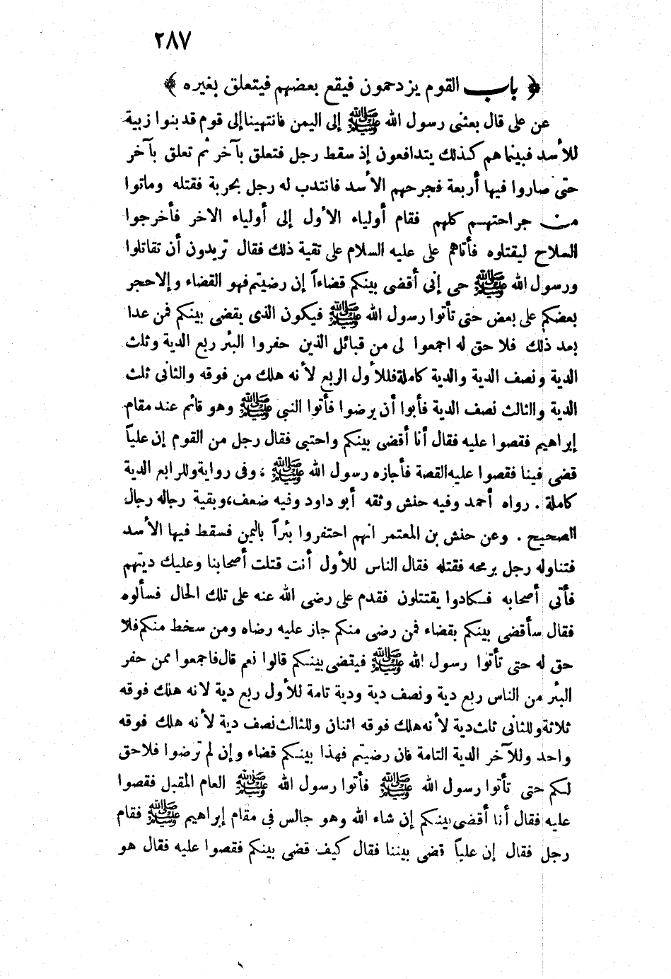 10724 - «عَنْ عَلِيٍّ قَالَ: بَعَثَنِي رَسُولُ اللَّهِ - صَلَّى اللَّهُ عَلَيْهِ وَسَلَّمَ - إِلَى الْيَمَنِ، فَانْتَهَيْنَا إِلَى قَوْمٍ قَدْ بَنَوْا زُبْيَةً لِلْأَسَدِ، فَبَيْنَمَا هُمْ كَذَلِكَ يَتَدَافَعُونَ إِذْ سَقَطَ رَجُلٌ، فَتَعَلَّقَ بِآخَرَ، ثُمَّ تَعَلَّقَ بِآخَرَ حَتَّى صَارُوا فِيهَا أَرْبَعَةً، فَجَرَحَهُمُ الْأَسَدُ، فَانْتَدَبَ لَهُ رَجُلٌ بِحَرْبَةٍ فَقَتَلَهُ، وَمَاتُوا مِنْ جِرَاحَتِهِمْ كُلُّهُمْ.