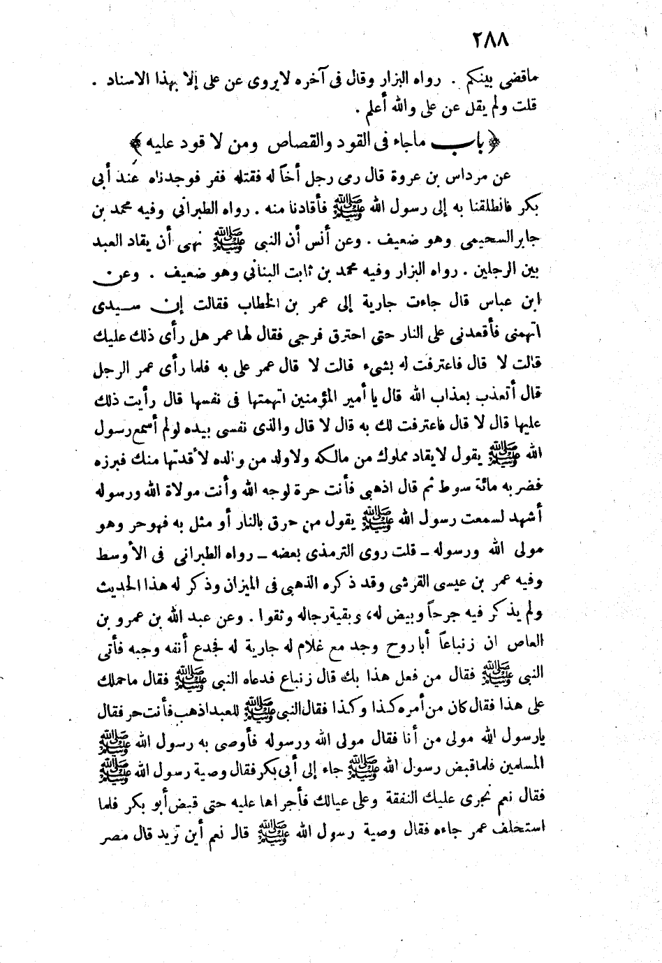 فَلَمَّا أَتَى عُمَرَ الرَّجُلُ، قَالَ: أَتُعَذِّبُ بِعَذَابِ اللَّهِ؟ قَالَ: يَا أَمِيرَ الْمُؤْمِنِينَ، اتَّهَمْتُهَا فِي نَفْسِهَا، قَالَ: رَأَيْتَ ذَلِكَ عَلَيْهَا؟ قَالَ: لَا. قَالَ: فَاعْتَرَفَتْ لَكَ بِهِ؟ قَالَ: لَا. قَالَ: وَالَّذِي نَفْسِي بِيَدِهِ، لَوْ لَمْ «أَسْمَعْ رَسُولَ اللَّهِ - صَلَّى اللَّهُ عَلَيْهِ وَسَلَّمَ - يَقُولُ: " لَا يُقَادُ مَمْلُوكٌ مِنْ مَالِكِهِ، وَلَا وَلَدٌ مِنْ وَالِدِهِ» " لَأَقَدْتُهَا مِنْكَ. فَبَرَّزَهُ فَضَرَبَهُ مِائَةَ سَوْطٍ ثُمَّ قَالَ: اذْهَبِي فَأَنْتِ حُرَّةٌ لِوَجْهِ اللَّهِ، وَأَنْتِ مُوَلَاةُ اللَّهِ وَرَسُولِهِ، «أَشْهَدُ لَسَمِعْتُ رَسُولَ اللَّهِ - صَلَّى اللَّهُ عَلَيْهِ وَسَلَّمَ - يَقُولُ: " مَنْ حُرِّقَ بِالنَّارِ أَوْ مُثِّلَ بِهِ، فَهُوَ حُرٌّ، وَهُوَ مَوْلَى اللَّهِ وَرَسُولِهِ» ".