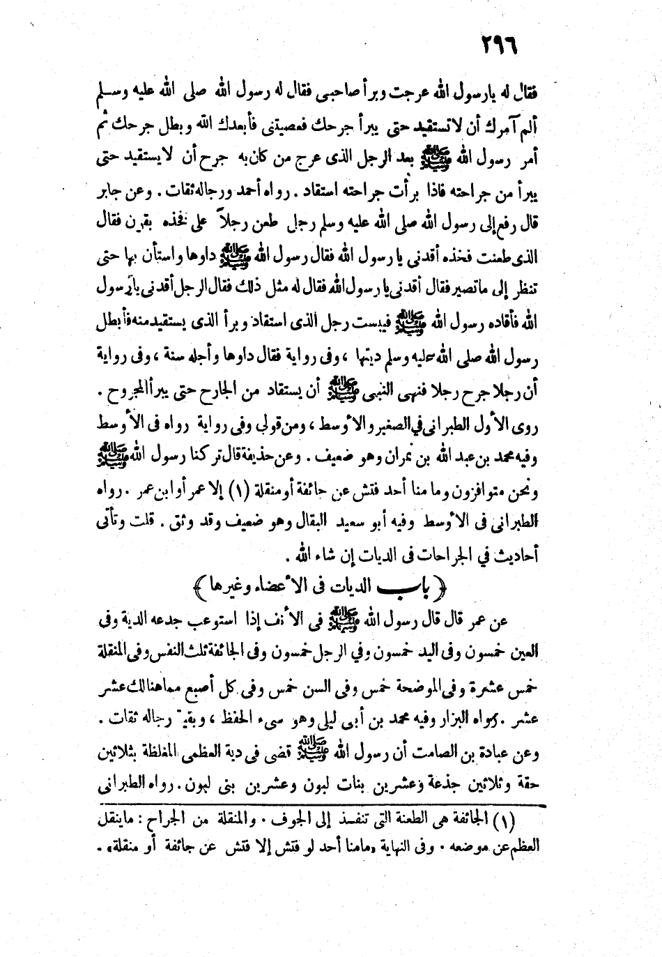 رَوَاهُ الطَّبَرَانِيُّ فِي الْأَوْسَطِ، وَفِيهِ أَبُو سَعِيدٍ الْبَقَّالُ، وَهُوَ ضَعِيفٌ وَقَدْ وُثِّقَ. قُلْتُ: وَتَأْتِي أَحَادِيثُ فِي الْجِرَاحَاتِ فِي الدِّيَاتِ إِنْ شَاءَ اللَّهُ.