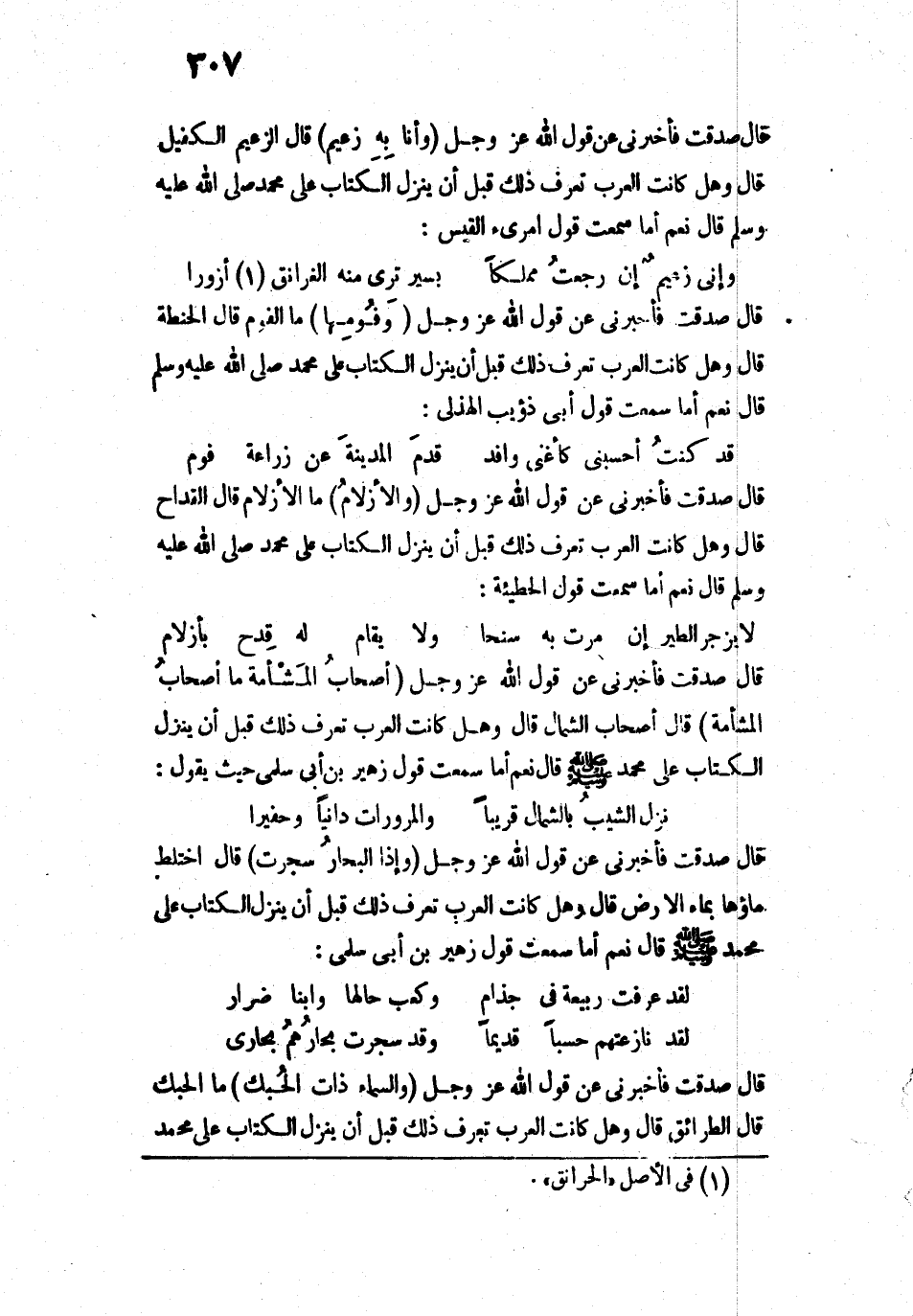 قَالَ: صَدَقْتَ، فَأَخْبِرْنِي عَنْ قَوْلِ اللَّهِ عَزَّ وَجَلَّ: {وَفُومِهَا} [البقرة: 61]، مَا الْفُومُ؟ قَالَ: الْحِنْطَةُ. قَالَ: وَهَلْ كَانَتِ الْعَرَبُ تَعْرِفُ ذَلِكَ قَبْلَ أَنْ يَنْزِلَ الْكِتَابُ عَلَى مُحَمَّدٍ، صَلَّى اللَّهُ عَلَيْهِ وَسَلَّمَ؟ قَالَ: نَعَمْ، أَمَا سَمِعْتَ قَوْلَ أَبِي ذُؤَيْبٍ الْهُذَلِيِّ: