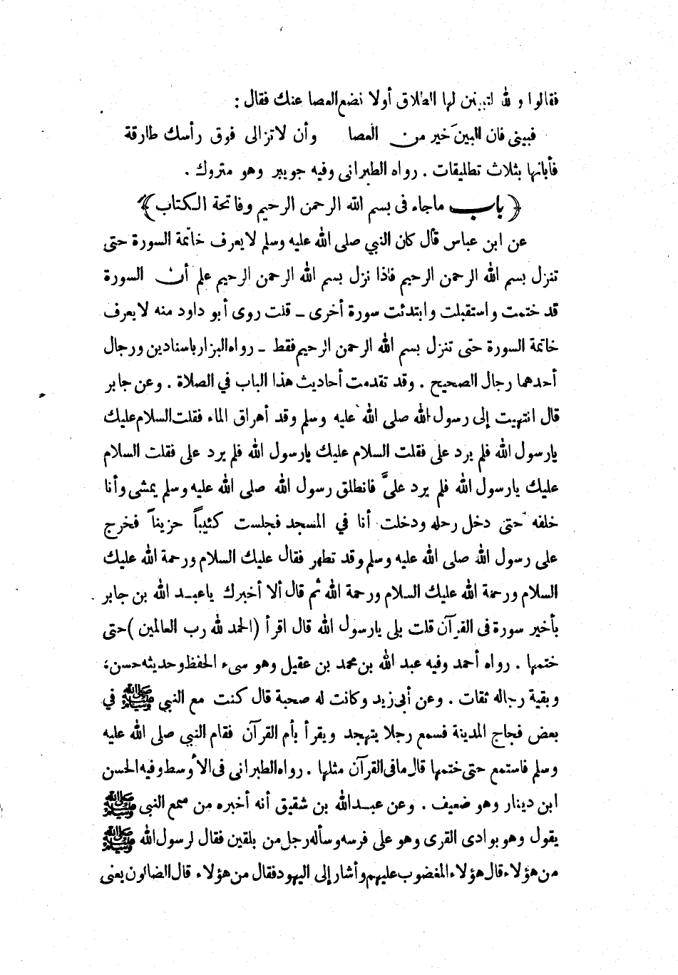 10807 - وَعَنْ جَابِرٍ قَالَ: «انْتَهَيْتُ إِلَى رَسُولِ اللَّهِ - صَلَّى اللَّهُ عَلَيْهِ وَسَلَّمَ - وَقَدْ أَهَرَاقَ الْمَاءَ، فَقُلْتُ: السَّلَامُ عَلَيْكَ يَا رَسُولَ اللَّهِ. فَلَمْ يَرُدَّ عَلَيَّ فَقُلْتُ: السَّلَامُ عَلَيْكَ يَا رَسُولَ اللَّهِ، فَلَمْ يَرُدَّ عَلَيَّ فَقُلْتُ: السَّلَامُ عَلَيْكَ يَا رَسُولَ اللَّهِ. فَلَمْ يَرُدَّ عَلَيَّ، فَانْطَلَقَ رَسُولُ اللَّهِ - صَلَّى اللَّهُ عَلَيْهِ وَسَلَّمَ - يَمْشِي وَأَنَا خَلْفَهُ حَتَّى دَخَلَ رَحْلَهُ، وَدَخَلْتُ أَنَا فِي الْمَسْجِدِ فَجَلَسْتُ كَئِيبًا حَزِينًا، فَخَرَجَ عَلَيَّ رَسُولُ اللَّهِ - صَلَّى اللَّهُ عَلَيْهِ وَسَلَّمَ - وَقَدْ تَطَهَّرَ، فَقَالَ: " عَلَيْكَ السَّلَامُ وَرَحْمَةُ اللَّهِ، عَلَيْكَ السَّلَامُ وَرَحْمَةُ اللَّهِ، عَلَيْكَ السَّلَامُ وَرَحْمَةُ اللَّهِ. ثُمَّ قَالَ: " أَلَا أُخْبِرُكَ يَا عَبْدَ اللَّهِ بْنَ جَابِرٍ بِأَخْيَرِ سُورَةٍ فِي الْقُرْآنِ؟ ". قُلْتُ: بَلَى يَا رَسُولَ اللَّهِ، قَالَ: " اقْرَأْ: الْحَمْدُ لِلَّهِ رَبِّ الْعَالَمِينَ " حَتَّى خَتَمَهَا».