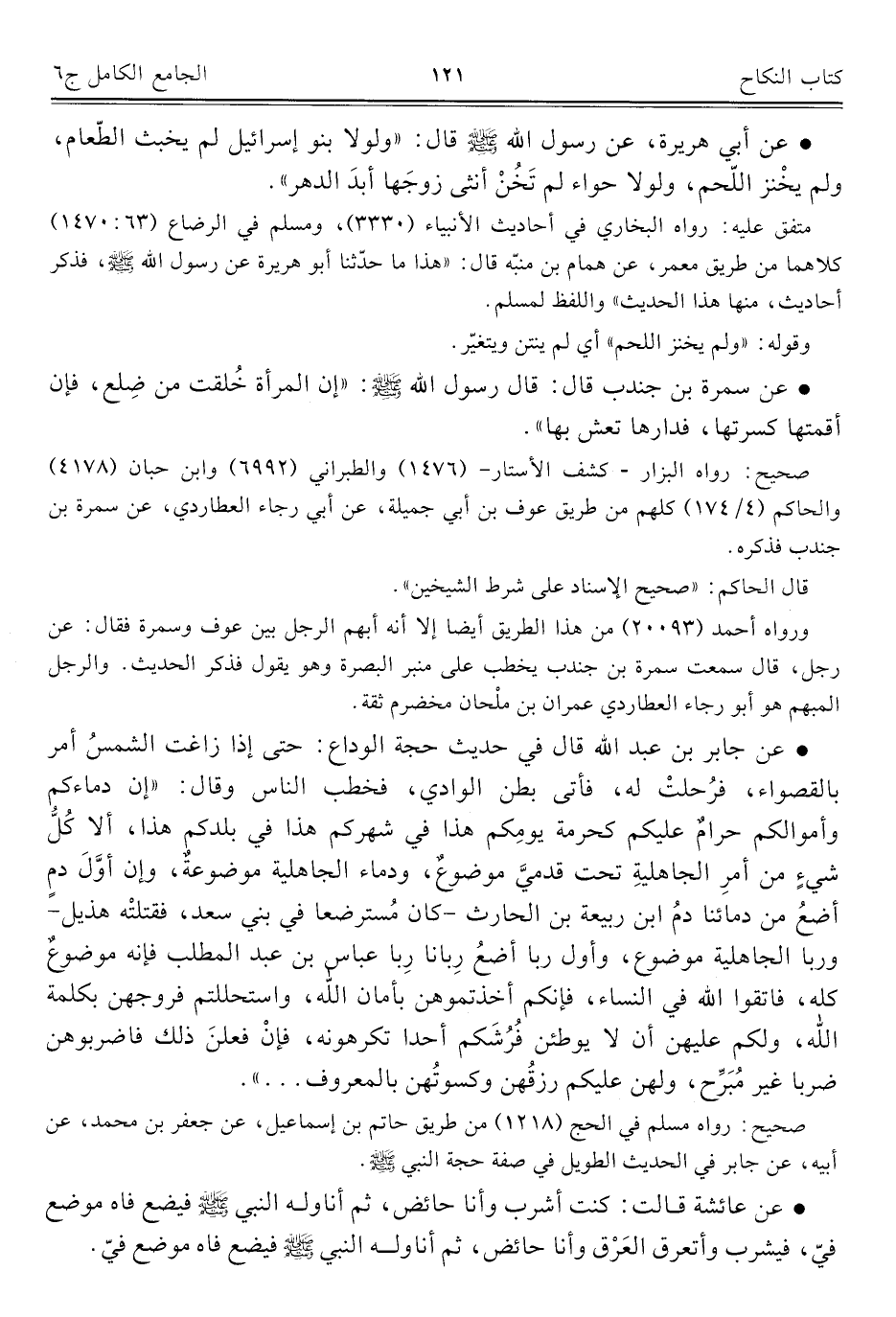 • عن جابر بن عبد اللَّه قال في حديث حجة الوداع: حتى إذا زاغت الشمسُ أمر بالقصواء، فرُحلتْ له، فأتي بطن الوادي، فخطب الناس وقال: "إن دماءكم وأموالكم حرامٌ عليكم كحرمة يومِكم هذا في شهركم هذا في بلدكم هذا، ألا كُلُّ شيءٍ من أمرِ الجاهليةِ تحت قدميَّ موضوعٌ، ودماء الجاهلية موضوعةٌ، وإن أوَّلَ دمٍ أضعُ من دمائنا دمُ ابن ربيعة بن الحارث -كان مُسترضعا في بني سعد، فقتلتْه هذيل- وربا الجاهلية موضوع، وأول ربا أضعُ رِبانا رِبا عباس بن عبد المطلب فإنه موضوعٌ كله، فاتقوا اللَّه في النساء، فإنكم أخذتموهن بأمان اللَّه، واستحللتم فروجهن بكلمة اللَّه، ولكم عليهن أن لا يوطئن فُرُشَكم أحدا تكرهونه، فإنْ فعلنَ ذلك فاضربوهن ضربا غير مُبَرِّح، ولهن عليكم رزقُهن وكسوتُهن بالمعروف. . . ".