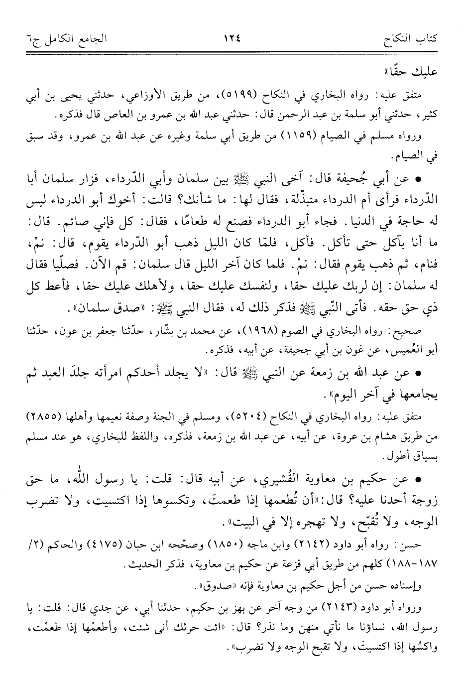 متفق عليه: رواه البخاري في النكاح (٥١٩٩)، من طريق الأوزاعي، حدثني يحيى بن أبي كثير، حدثني أبو سلمة بن عبد الرحمن قال: حدثني عبد اللَّه بن عمرو بن العاص قال فذكره.