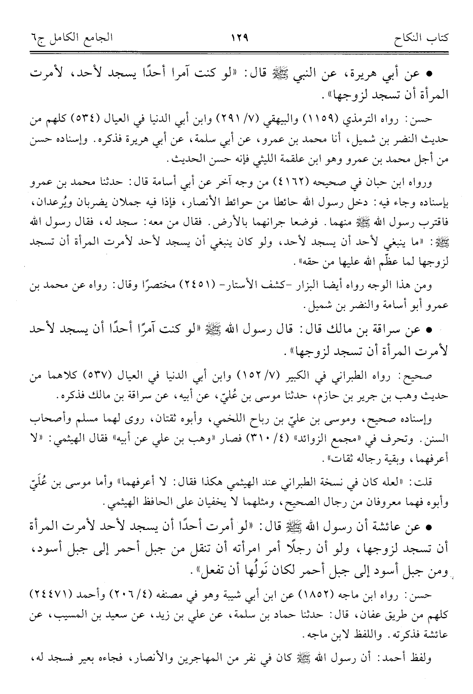 • عن أبي هريرة، عن النبي -صلى اللَّه عليه وسلم- قال: "لو كنت آمرا أحدًا يسجد لأحد، لأمرت المرأة أن تسجد لزوجها".