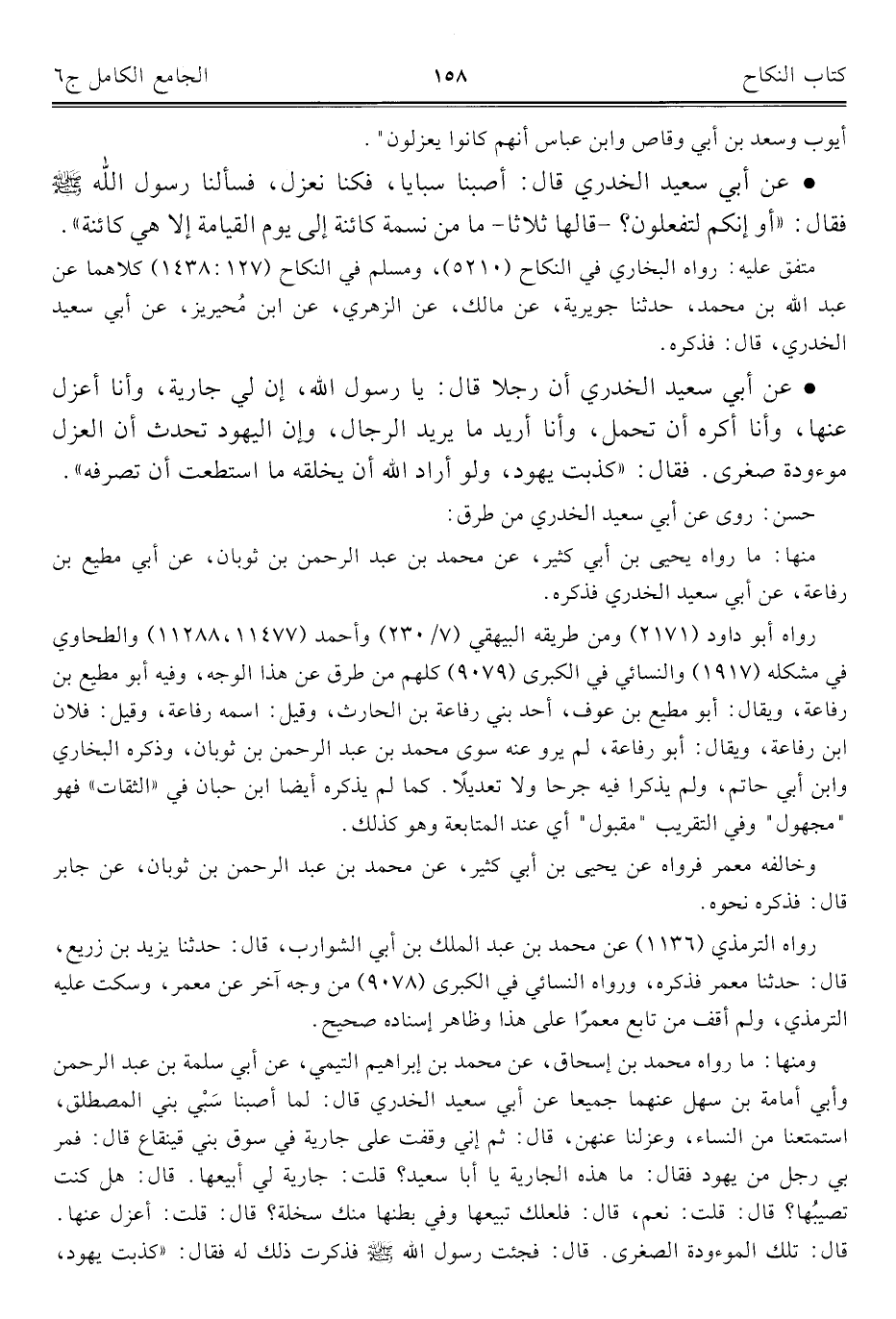 ومنها: ما رواه محمد بن إسحاق، عن محمد بن إبراهيم التيمي، عن أبي سلمة بن عبد الرحمن وأبي أمامة بن سهل عنهما جميعا عن أبي سعيد الخدري قال: لما أصبنا سَبْي بني المصطلق، استمتعنا من النساء، وعزلنا عنهن، قال: ثم إني وقفت على جارية في سوق بني قينقاع قال: فمر بي رجل من يهود فقال: ما هذه الجارية يا أبا سعيد؟ قلت: جارية لي أبيعها. قال: هل كنت تصيبُها؟ قال: قلت: نعم، قال: فلعلك تبيعها وفي بطنها منك سخلة؟ قال: قلت: أعزل عنها. قال: تلك الموءودة الصغرى. قال: فجئت رسول اللَّه -صلى اللَّه عليه وسلم- فذكرت ذلك له فقال: "كذبت يهود،