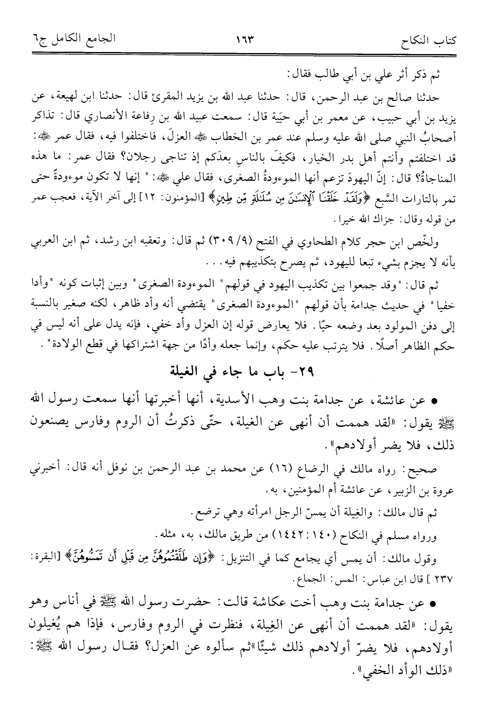 ثم قال: "وقد جمعوا بين تكذيب اليهود في قولهم "الموءودة الصغرى" وبين إثبات كونه "وأدا خفيا" في حديث جدامة بأن قولهم "الموءودة الصغرى" يقتضي أنه وأد ظاهر، لكنه صغير بالنسبة إلى دفن المولود بعد وضعه حيًا. فلا يعارض قوله إن العزل وأد خفي، فإنه يدل على أنه ليس في حكم الظاهر أصلًا. فلا يترتب عليه حكم، وإنما جعله وأدًا من جهة اشتراكها في قطع الولادة".