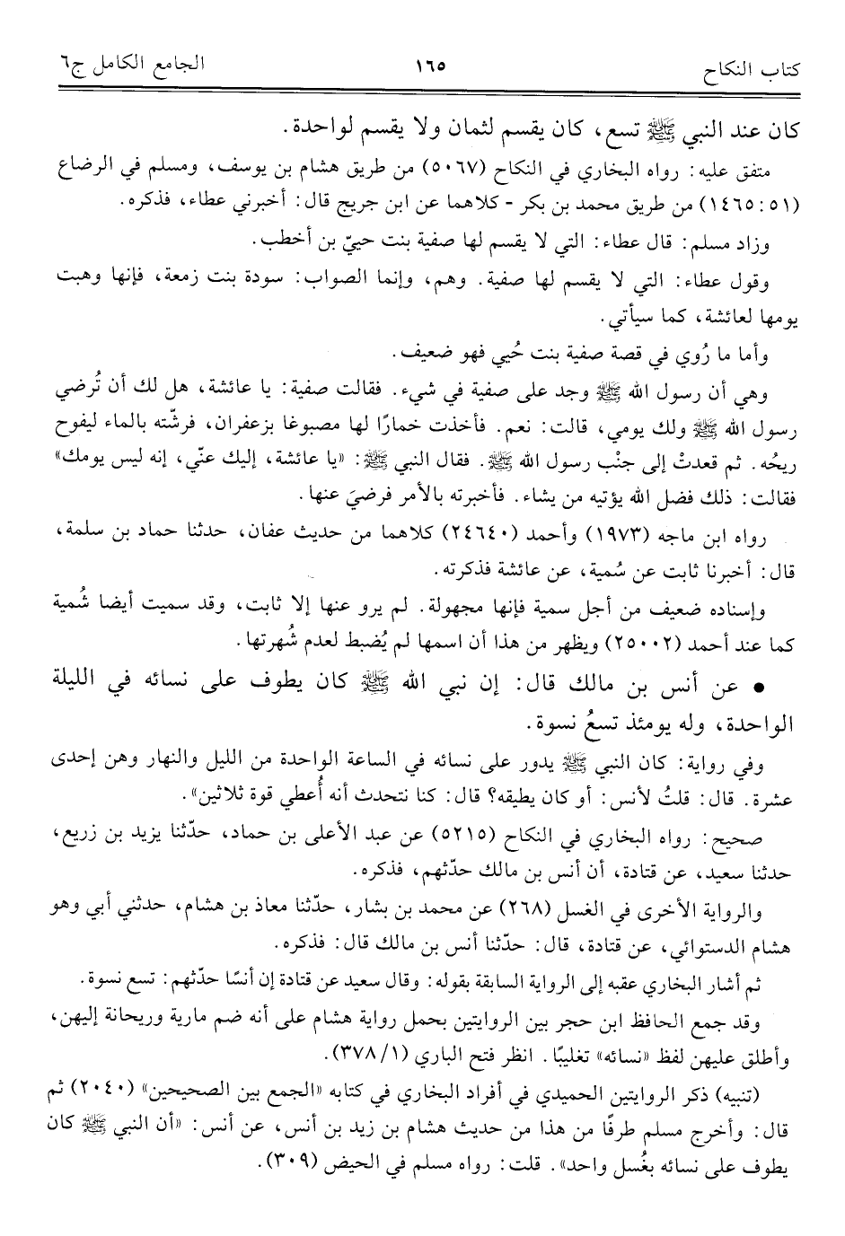 • عن أنس بن مالك قال: إن نبي اللَّه -صلى اللَّه عليه وسلم- كان يطوف على نسائه في الليلة الواحدة، وله يومئذ تسعُ نسوة.