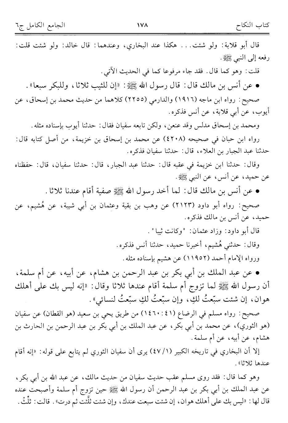 وهو كما قال: فقد روى مسلم عقب حديث سفيان من حديث مالك، عن عبد الله بن أبي بكر، عن عبد الملك بن أبي بكر بن عبد الرحمن أن رسول الله - صلى الله عليه وسلم - حين تزوج أم سلمة وأصبحت عنده قال لها: "ليس بك على أهلك هوان، إن شئت سبعت عندك، وإن شئت ثلَّثت ثم درت". قالت: ثلِّثْ.
