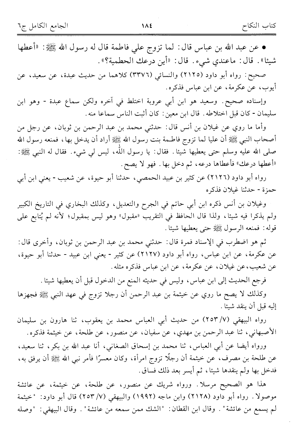 وأما ما روي عن غيلان بن أنس قال: حدثني محمد بن عبد الرحمن بن ثوبان، عن رجل من أصحاب النبي - صلى الله عليه وسلم - أن عليا لما تزوج فاطمة بنت رسول الله - صلى الله عليه وسلم - أراد أن يدخل بها، فمنعه رسول الله صلى الله عليه وسلم حتى يعطيها شيئا. فقال: يا رسول الله، ليس لي شيء. فقال له النبي - صلى الله عليه وسلم -: "فأعطها درعك" فأعطاها درعه، ثم دخل بها. فهو لا يصح.