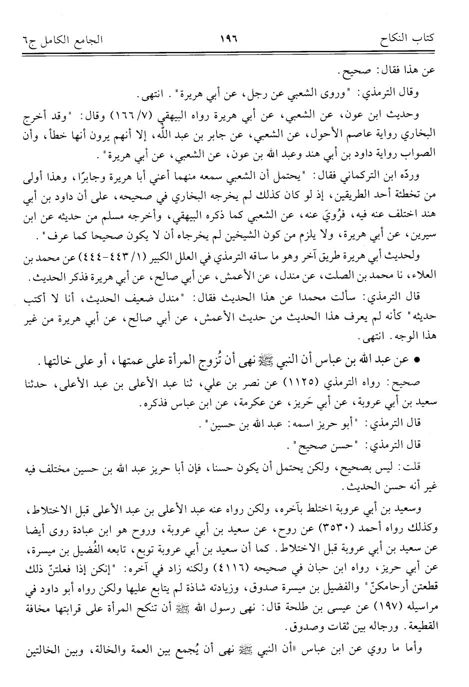 وسعيد بن أبي عروبة اختلط بآخره، ولكن رواه عنه عبد الأعلى بن عبد الأعلى قبل الاختلاط، وكذلك رواه أحمد (٣٥٣٠) عن روح، عن سعيد بن أبي عروبة، وروح هو ابن عبادة روى أيضا عن سعيد بن أبي عروبة قبل الاختلاط. كما أن سعيد بن أبي عروبة توبع، تابعه الفُضيل بن مبسرة، عن أبي حريز، رواه ابن حبان في صحيحه (٤١١٦) ولكنه زاد في آخره: "إنكن إذا فعلتنّ ذلك قطعتن أرحامكنّ" والفضيل بن ميسرة صدوق، وزيادته شاذة ثم يتابع عليها ولكن رواه أبو داود في مراسيله (١٩٧) عن عيسى بن طلحة قال: نهى رسول الله - صلى الله عليه وسلم - أن تنكح المرأة على قرابتها مخافة القطيعة. ورجاله بين ثقات وصدوق.