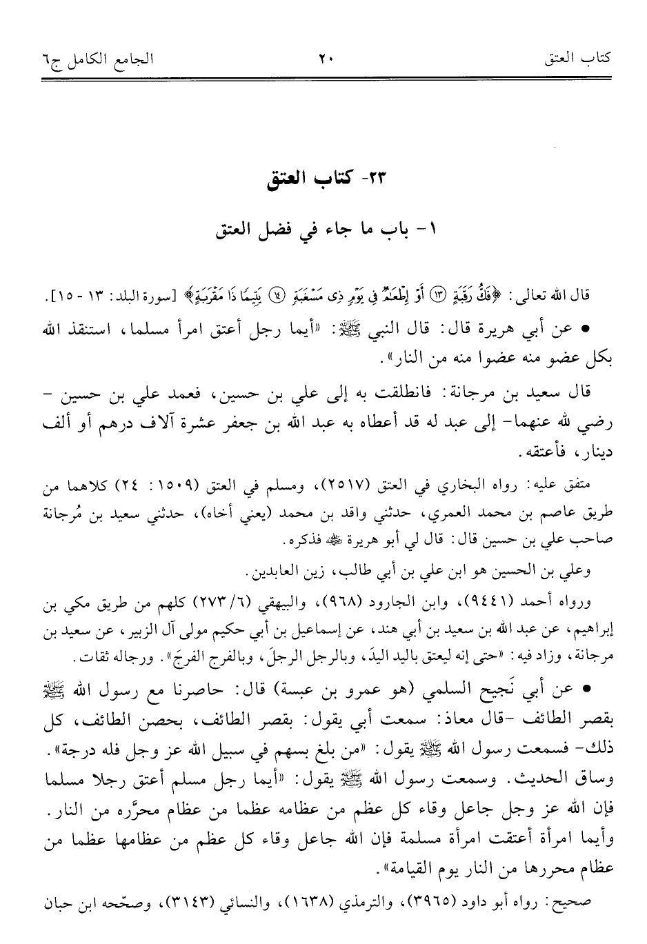 • عن أبي نَجيح السلمي (هو عمرو بن عبسة) قال: حاصرنا مع رسول اللَّه -صلى اللَّه عليه وسلم- بقصر الطائف -قال معاذ: سمعت أبي يقول: بقصر الطائف، بحصن الطائف، كل ذلك- فسمعت رسول اللَّه -صلى اللَّه عليه وسلم- يقول: "من بلغ بسهم في سبيل اللَّه عز وجل فله درجة". وساق الحديث. وسمعت رسول اللَّه -صلى اللَّه عليه وسلم- يقول: "أيما رجل مسلم أعتق رجلا مسلما فإن اللَّه عز وجل جاعل وقاء كل عظم من عظامه عظما من عظام محرَّره من النار. وأيما امرأة أعتقت امرأة مسلمة فإن اللَّه جاعل وقاء كل عظم من عظامها عظما من عظام محررها من النار يوم القيامة".