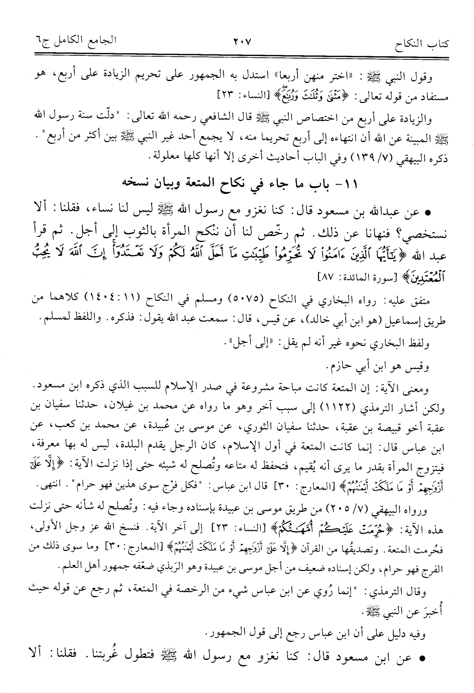• عن عبد الله بن مسعود قال: كنا نغزو مع رسول الله صلى الله عليه وسلم ليس لنا نساء، فقلنا: ألا نستخصي؟ فنهانا عن ذلك. ثم رخّص لنا أن ننْكح المرأة بالثوب إلى أجل. ثم قرأ عبد الله {يَاأَيُّهَا الَّذِينَ آمَنُوا لَا تُحَرِّمُوا طَيِّبَاتِ مَا أَحَلَّ اللَّهُ لَكُمْ وَلَا تَعْتَدُوا إِنَّ اللَّهَ لَا يُحِبُّ الْمُعْتَدِينَ} [سورة المائدة: ٨٧].