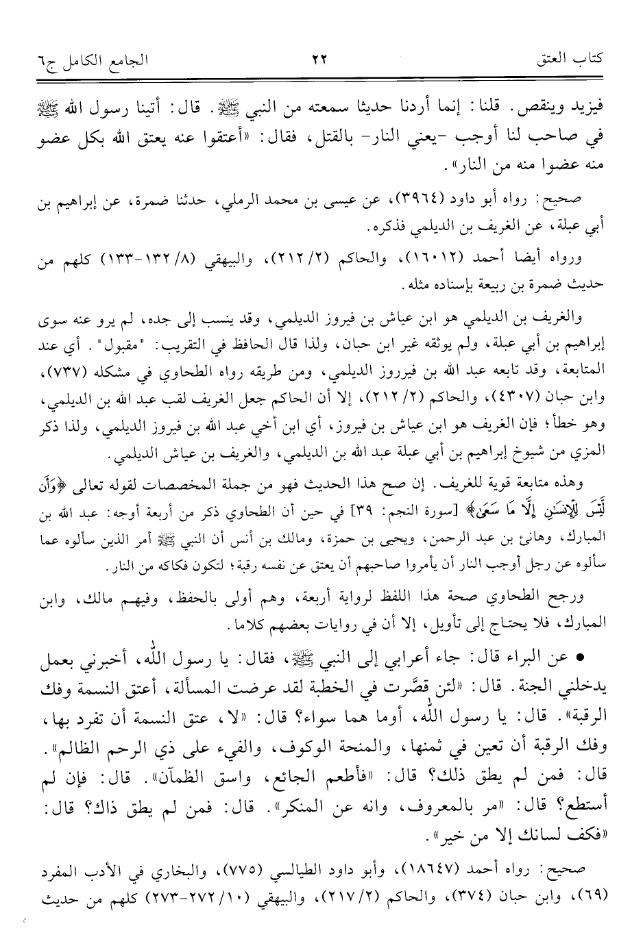 وهذه متابعة قوية للغريف. إن صح هذا الحديث فهو من جملة المخصصات لقوله تعالى {وَأَنْ لَيْسَ لِلْإِنْسَانِ إلا مَا سَعَى} [سورة النجم: ٣٩] في حين أن الطحاوي ذكر من أربعة أوجه: عبد اللَّه بن المبارك، وهانئ بن عبد الرحمن، ويحيى بن حمزة، ومالك بن أنس أن النبي -صلى اللَّه عليه وسلم- الأمر الذين سألوه عما سألوه عن رجل أوجب النار أن يأمروا صاحبهم أن يعتق عن نفسه رقبة؛ لتكون فكاكه من النار.