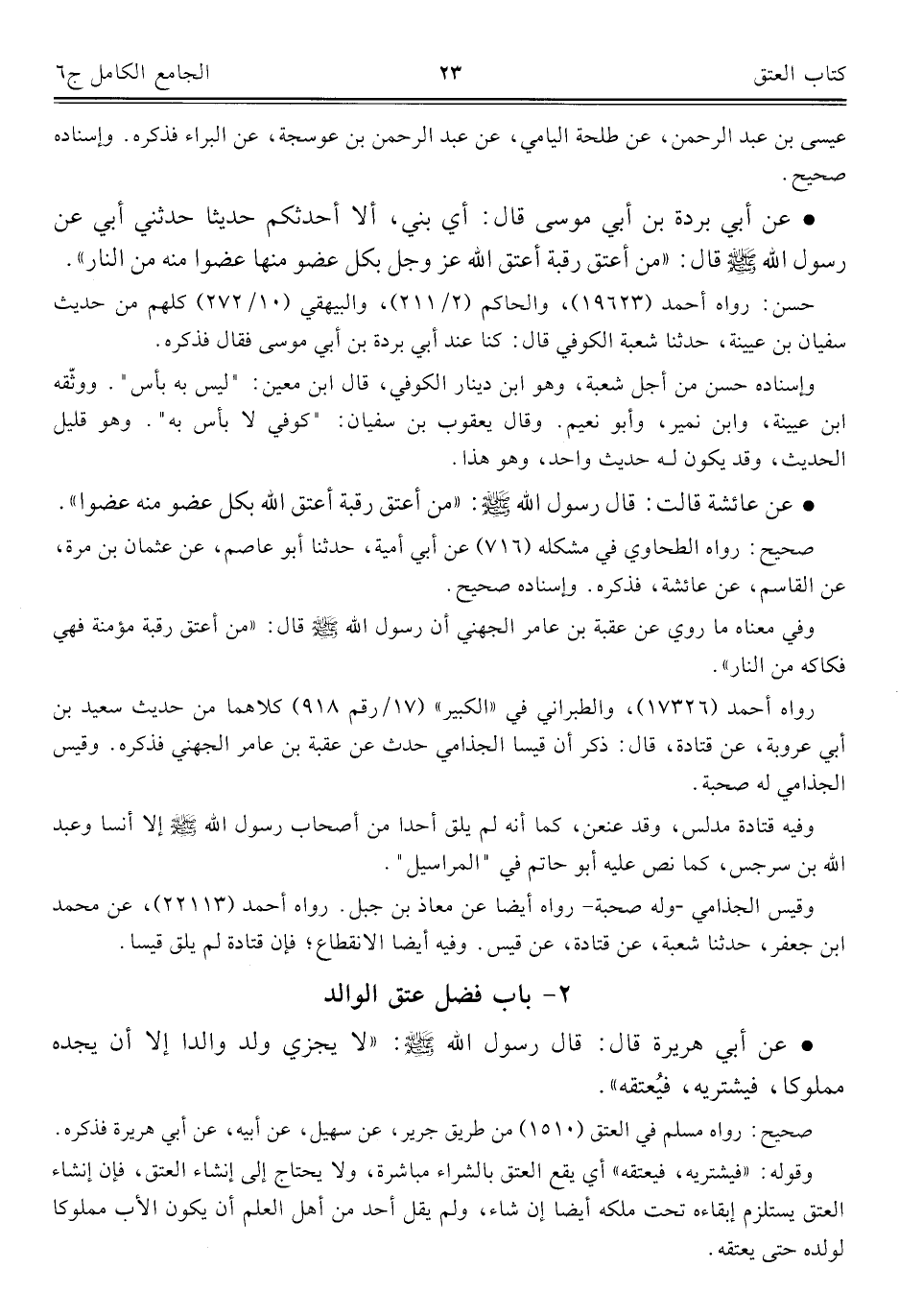 • عن أبي بردة بن أبي موسى قال: أي بني، ألا أحدثكم حديثا حدثني أبي عن رسول اللَّه -صلى اللَّه عليه وسلم- قال: "من أعتق رقبة أعتق اللَّه عز وجل بكل عضو منها عضوا منه من النار".